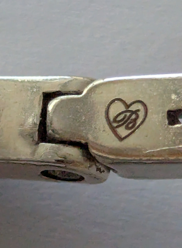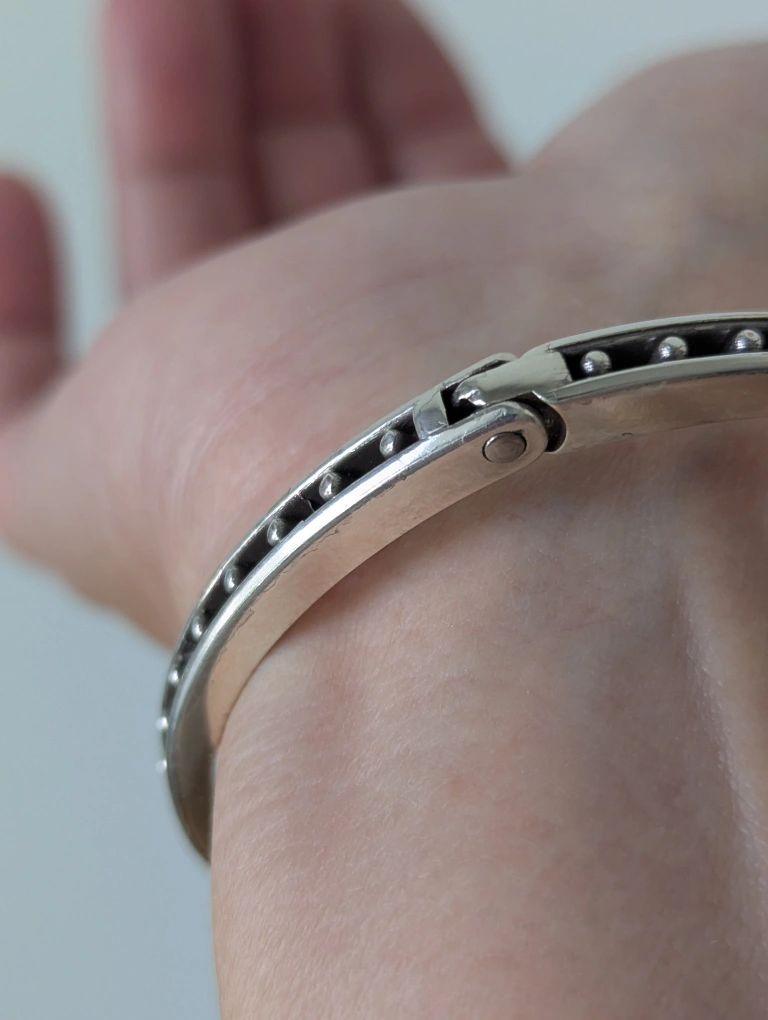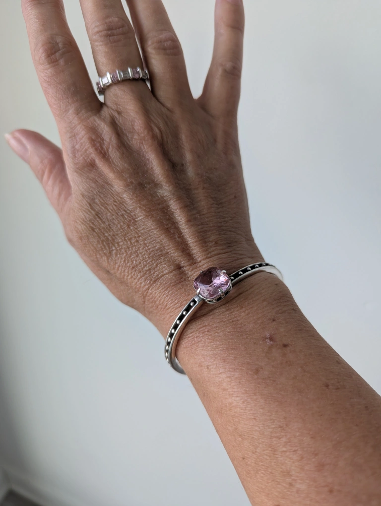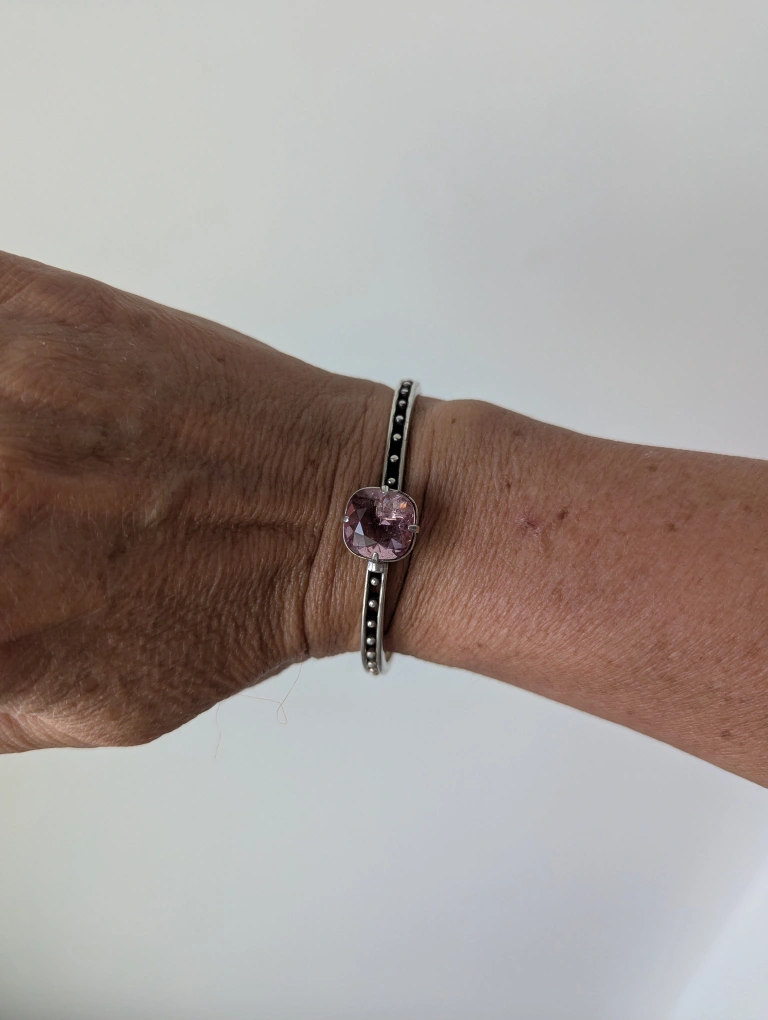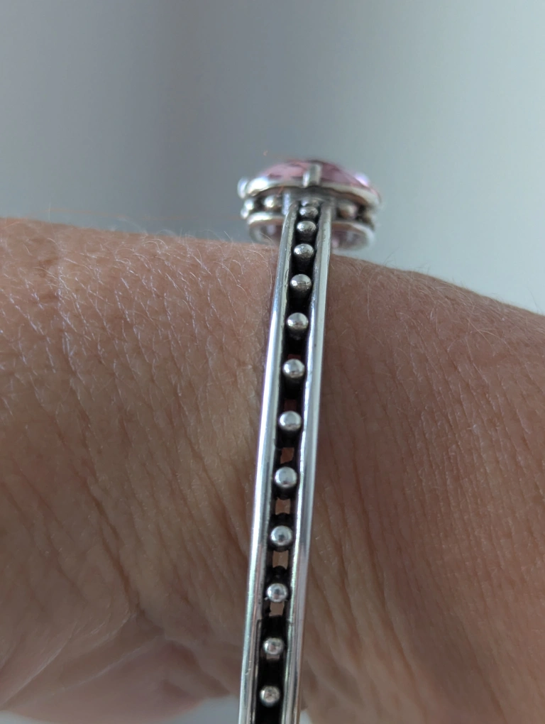 Stunning silver-toned bangle bracelet. Features a light pink cushion-cut crystal. Small silver beads along the edge. Hinged closure. Looks great on the wrist.