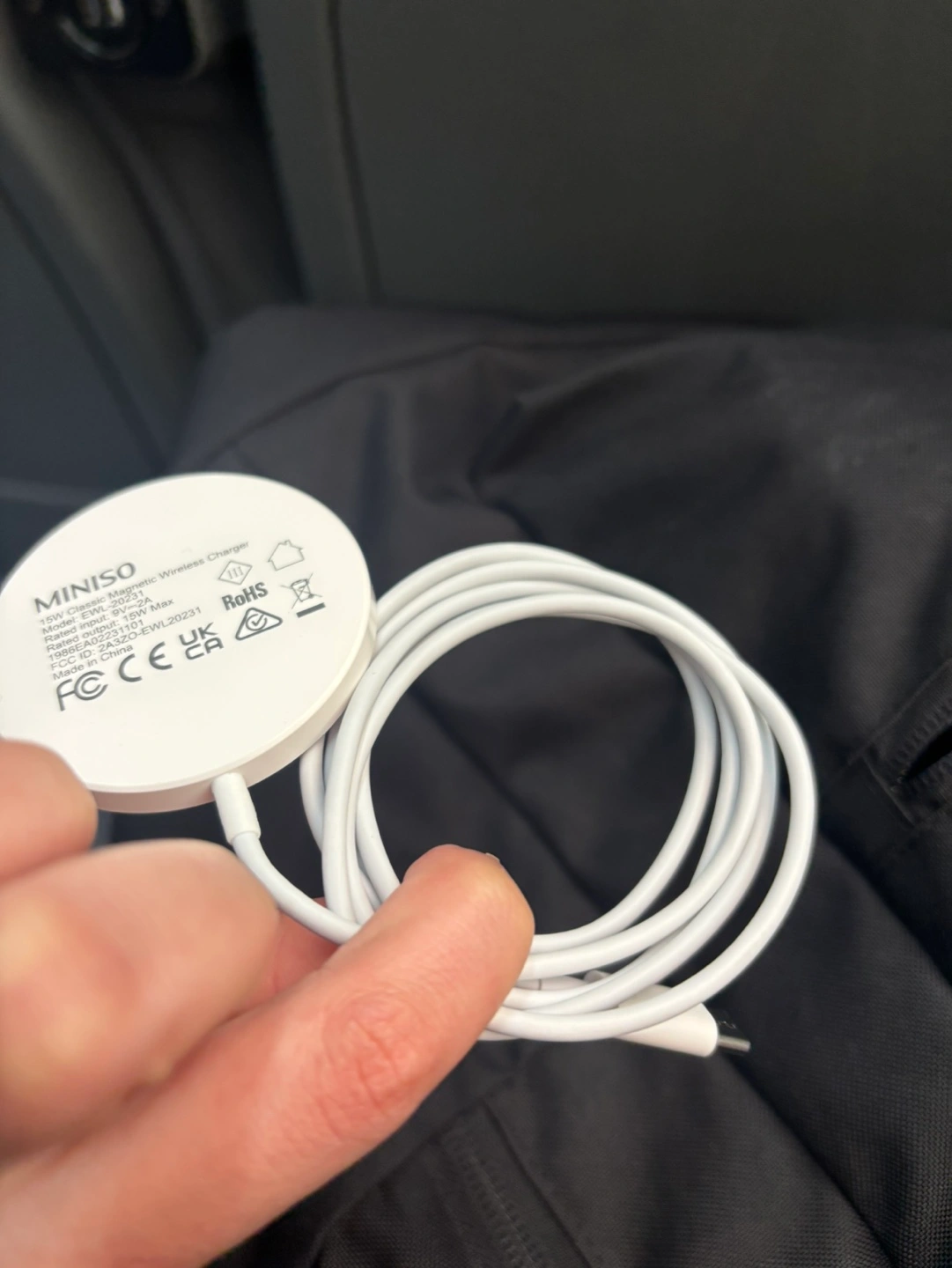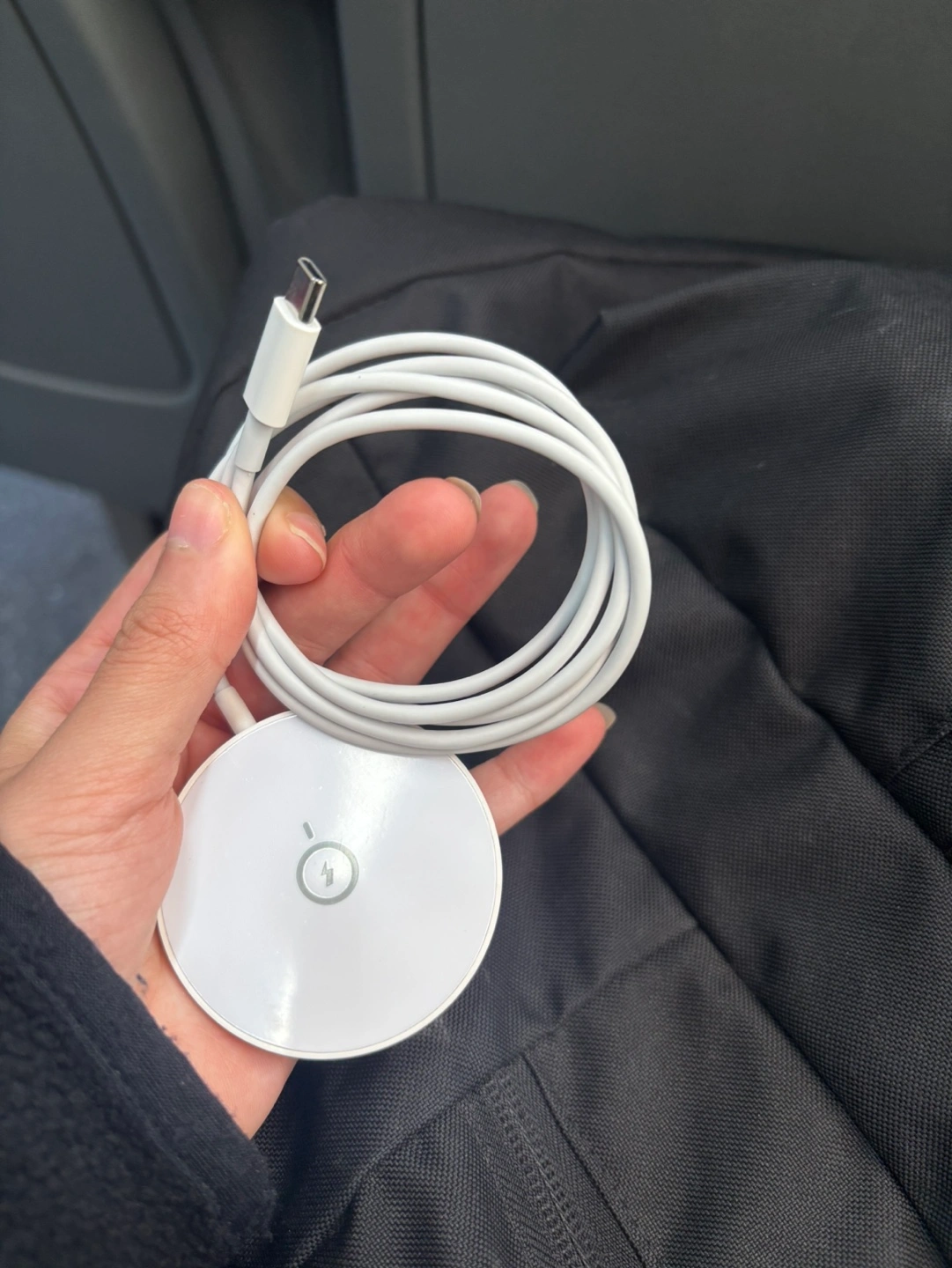 174White wireless charging pad. Includes USB-C charging cable. Compact and portable design. Great for travel. Originally 10
