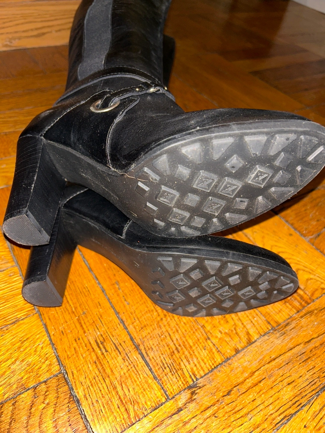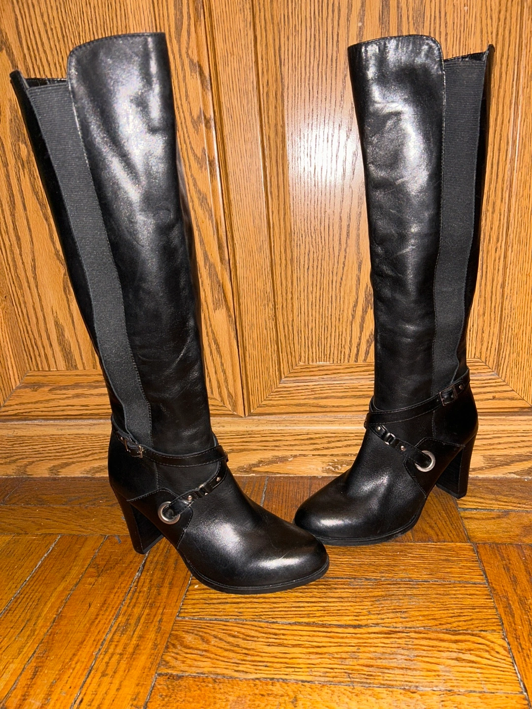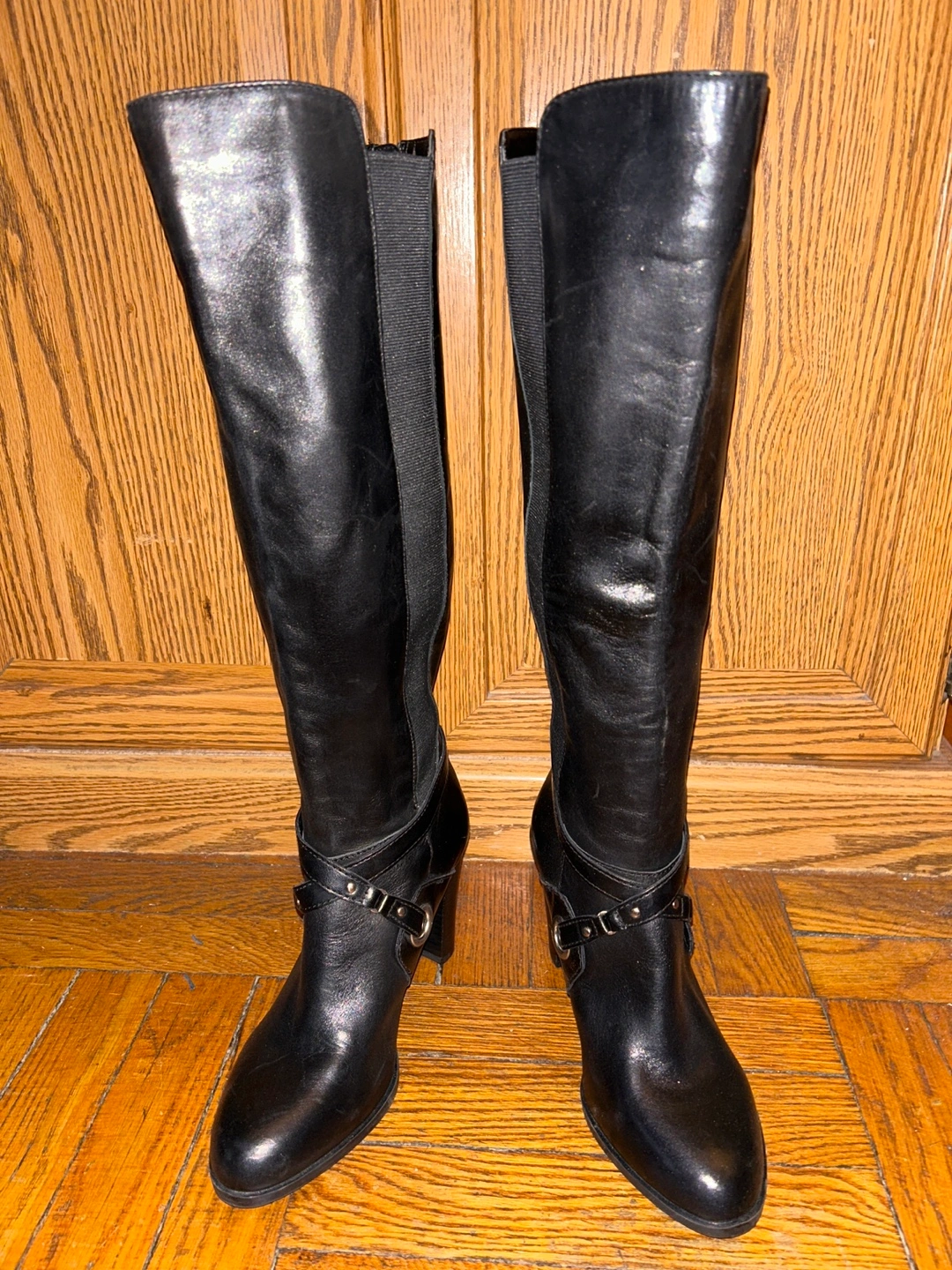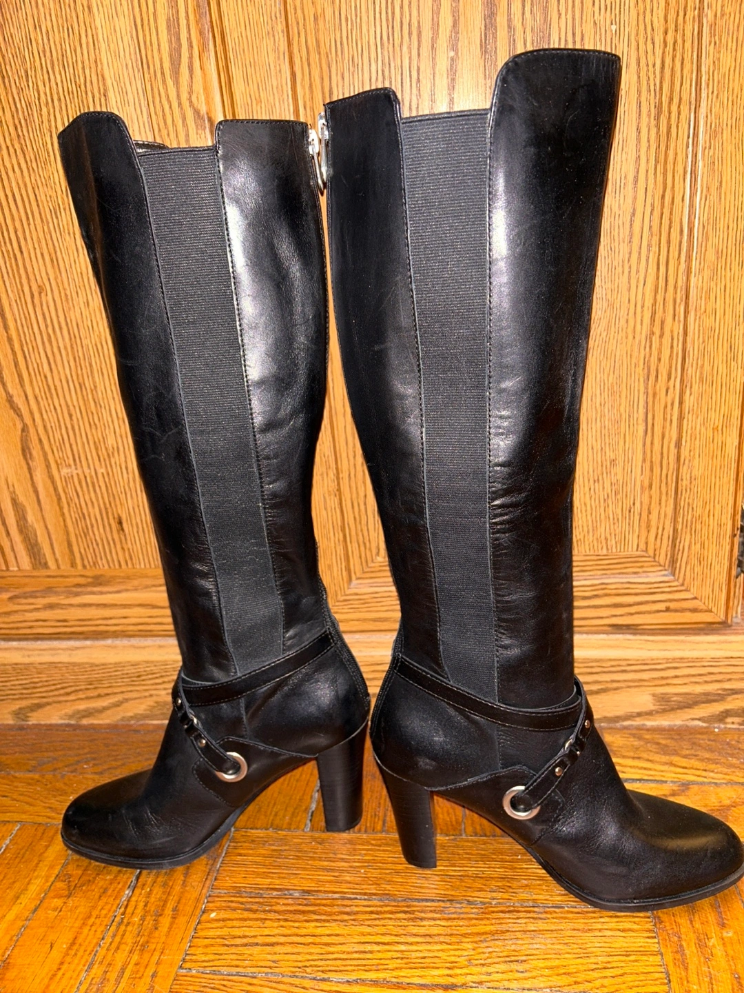 1000+Adrienne Vittadini Women's black leather knee-high boots. Features a 3 1/4” block heel and buckle detail. Back zipper closure. Excellent like new condition. Wore once.