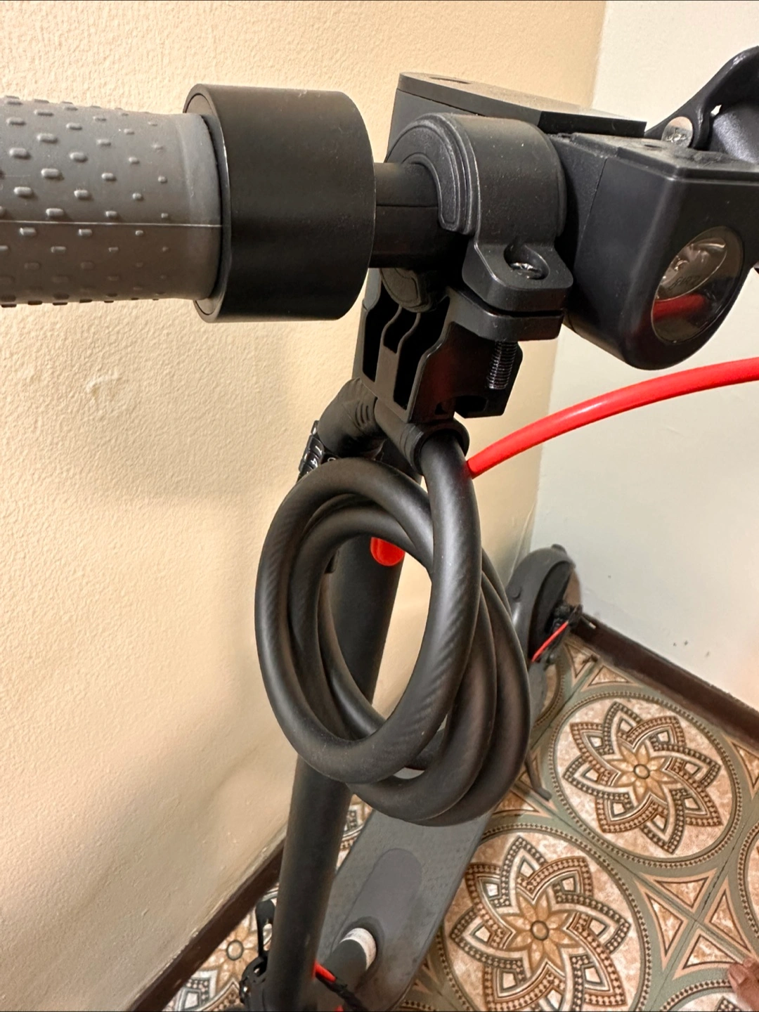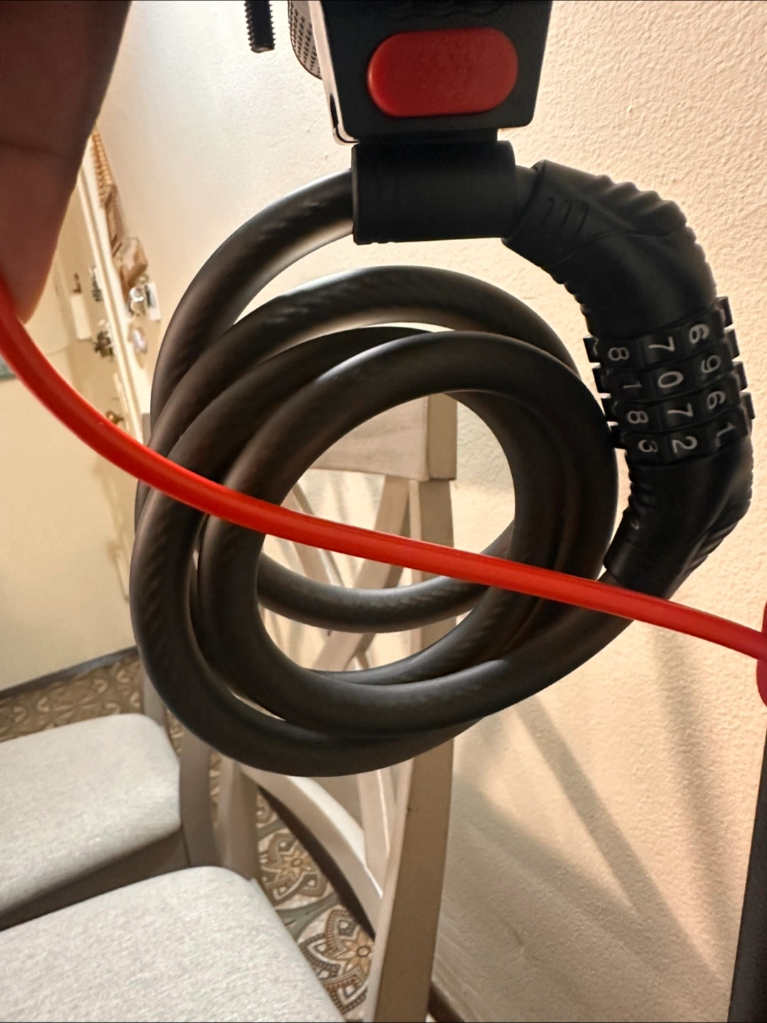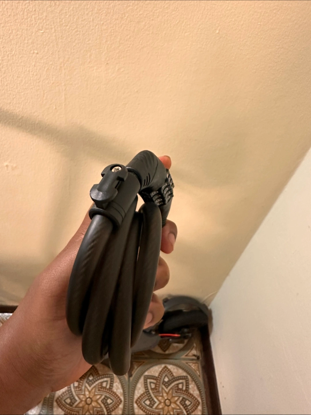 Selling a combination bike lock in black. It's in perfect condition and ready to keep your bike safe! It can hang from a bike or scooter—lock easily clips on and off. The combination is easy to change.