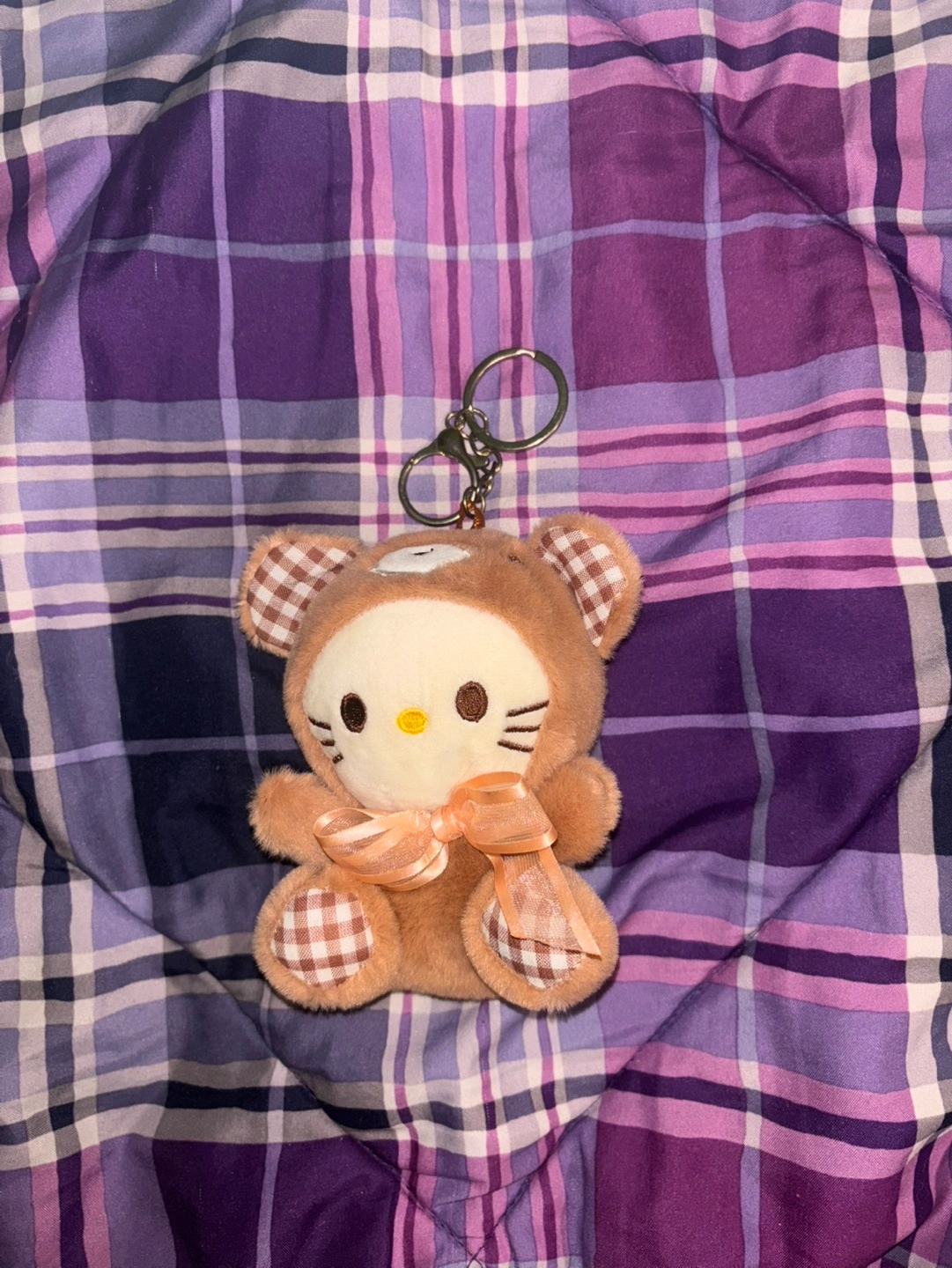 1000+Plush Hello Kitty bear keychain. Brown and tan. Features a cute orange bow. Perfect for bags or keys.