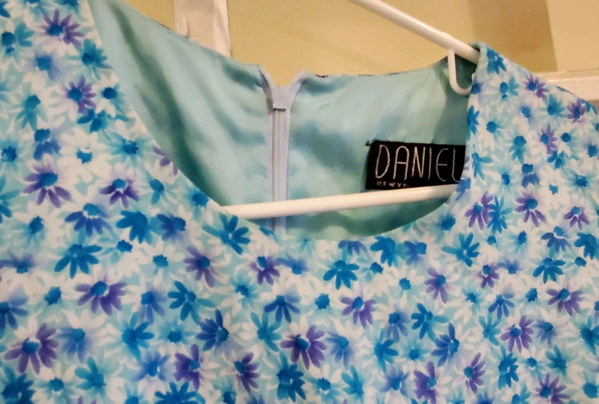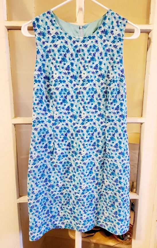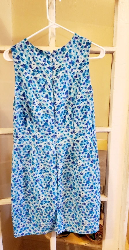 243Beautiful sleeveless summer dress. Pretty blue/turquise/purple floral print on white background. Back zipper closure. Round neck. Fully lined. Perfect for a summer party or everyday wear.