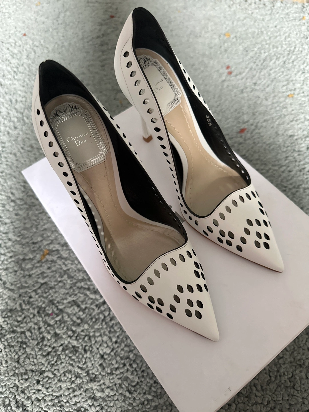 White leather pumps. Pointed toe. Cutout detailing. High heels. Size 35.5. Comes with original box. Worn once but other than that they are brand new!!