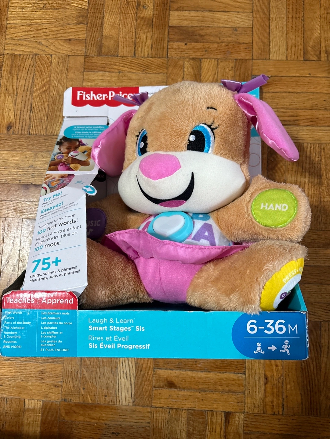 Interactive plush toy. Teaches first words, colours, parts of the body, alphabet, numbers, and more. 75+ songs, sounds, and phrases. Suitable for 6-36 months.