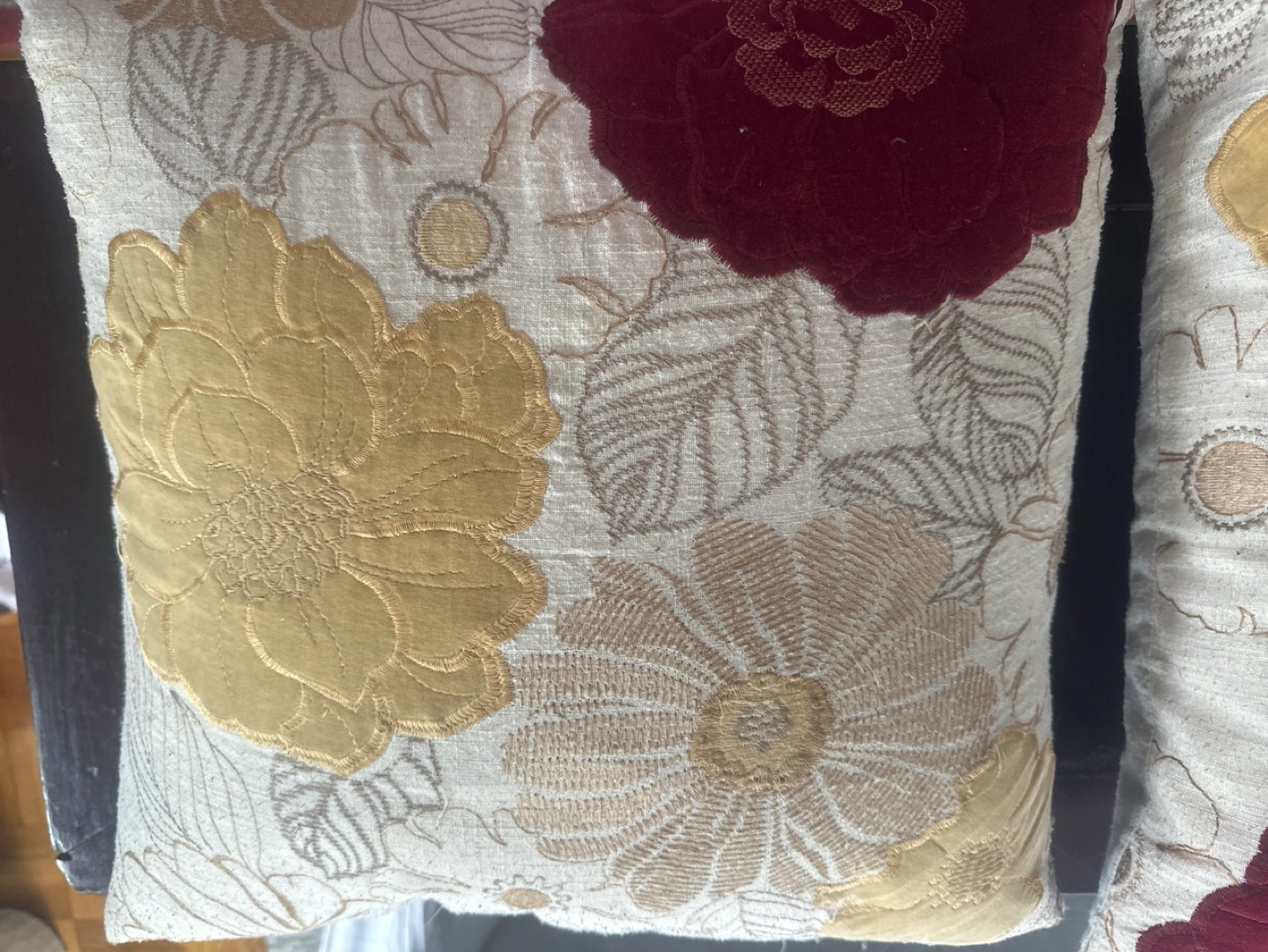 Set of two decorative throw pillows covers Beige linen-like fabric. Gold, burgundy, and brown embroidered floral design. Square shape. Home decor accents.