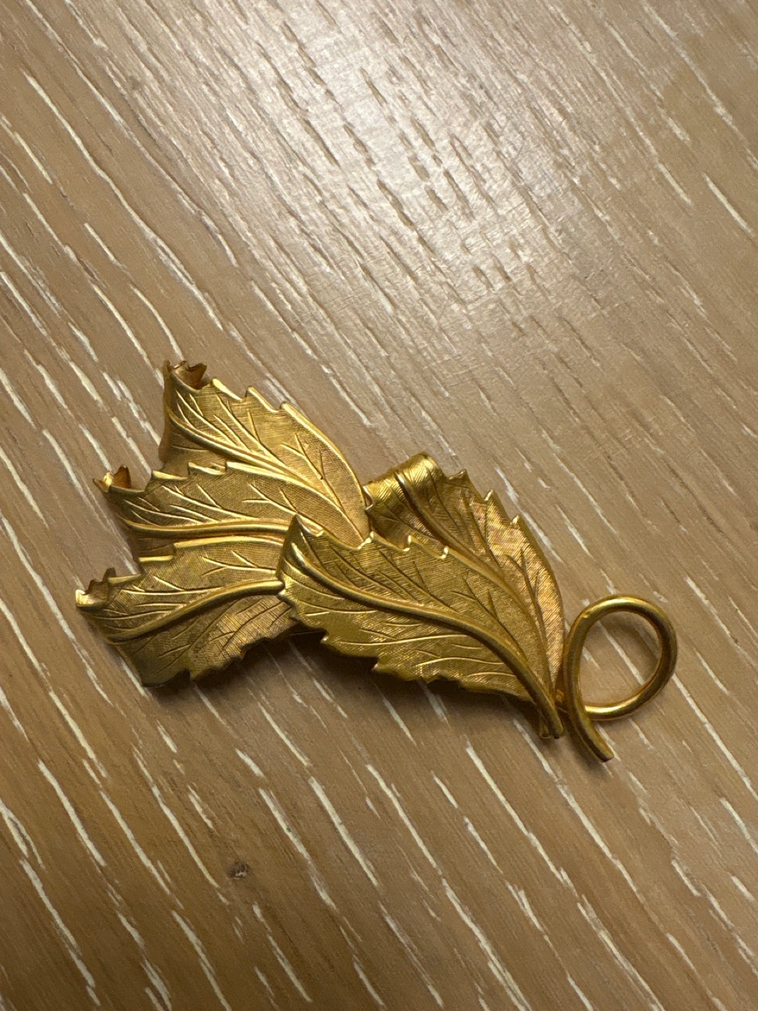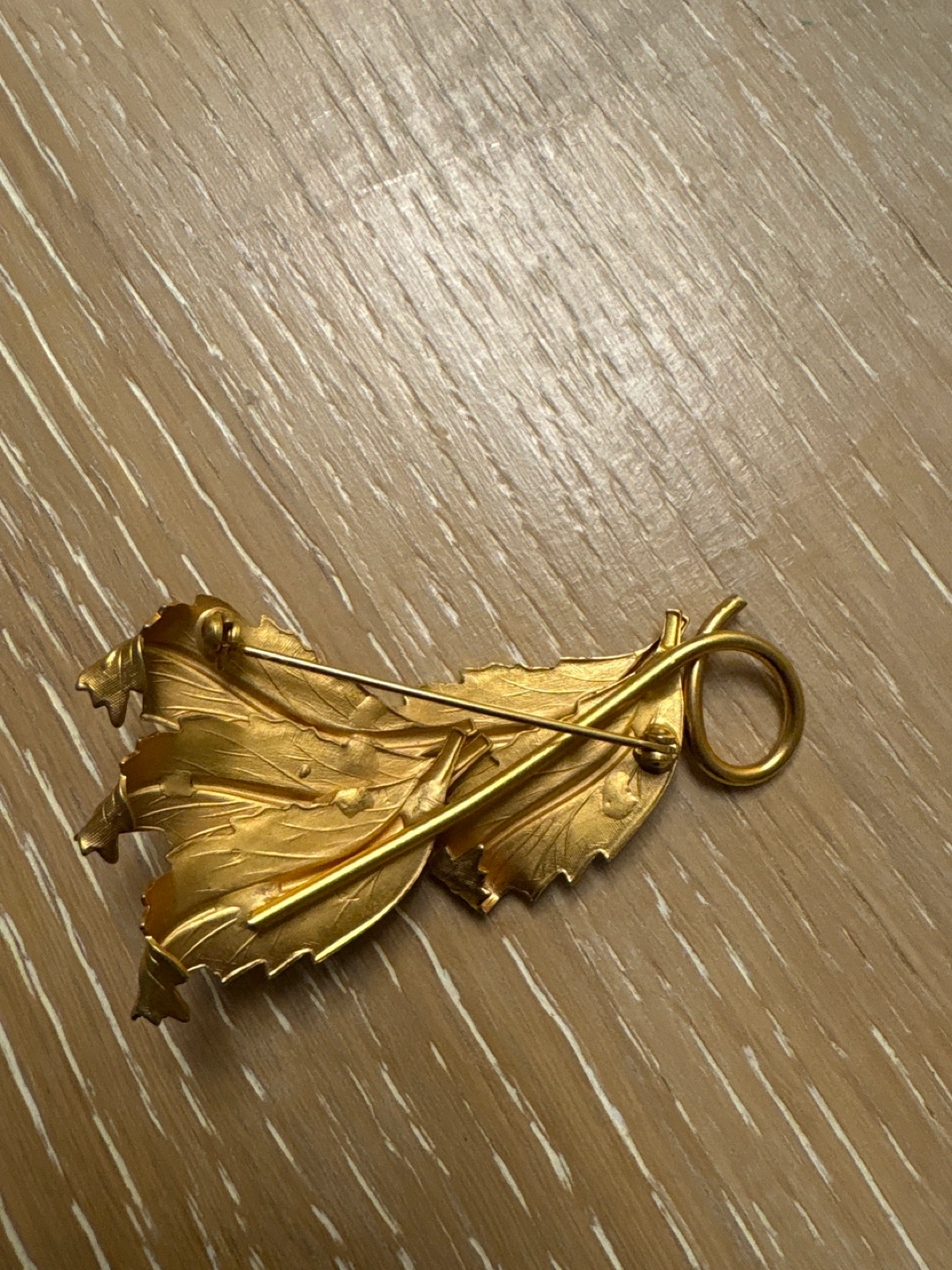 209Vintage gold-tone leaf brooch. Detailed leaf design. Pin and clasp functional. Great addition to any jewelry collection.