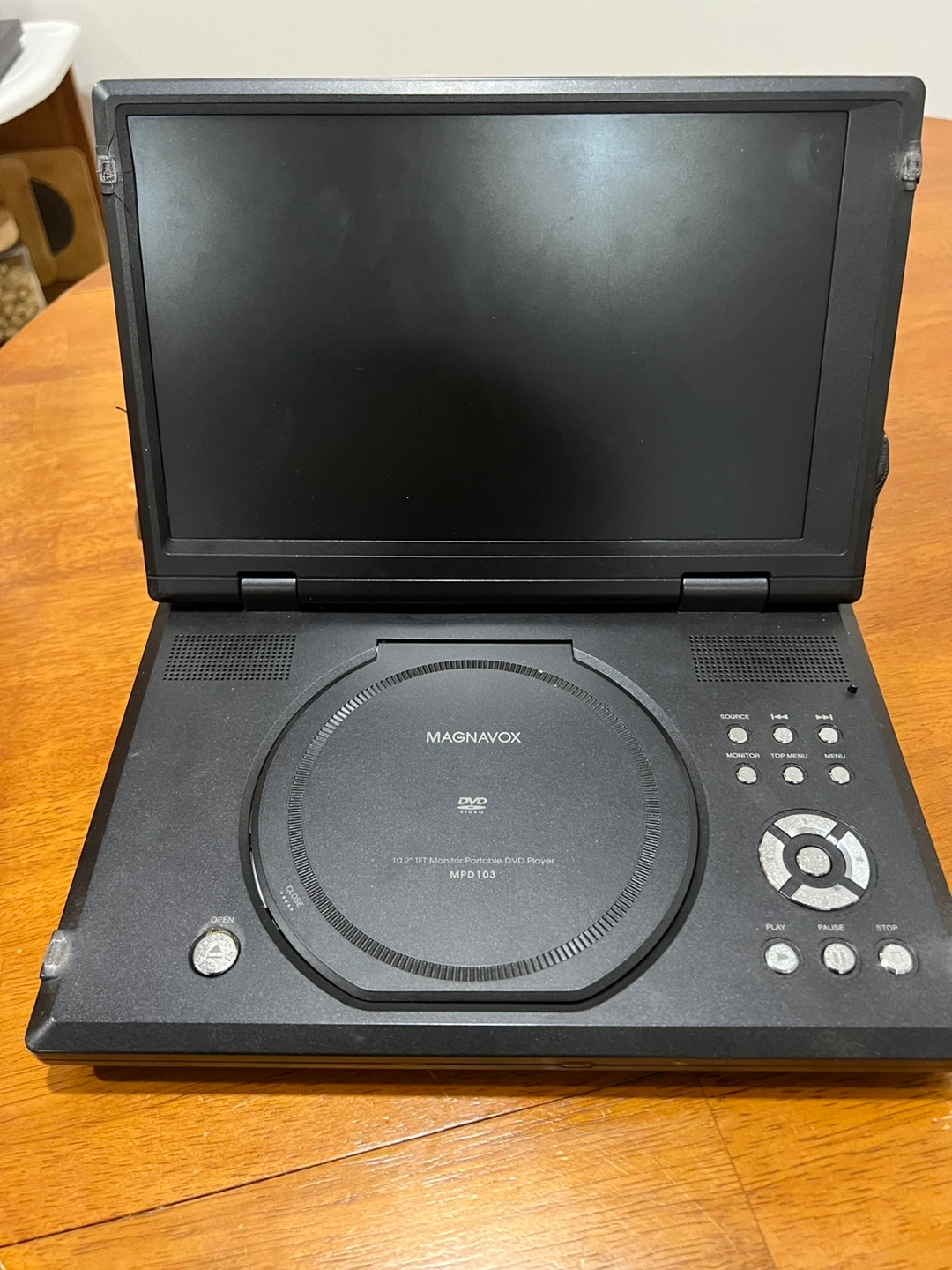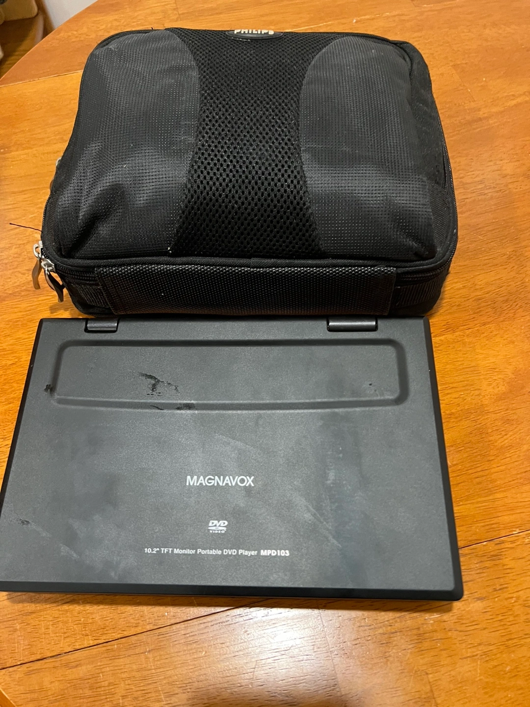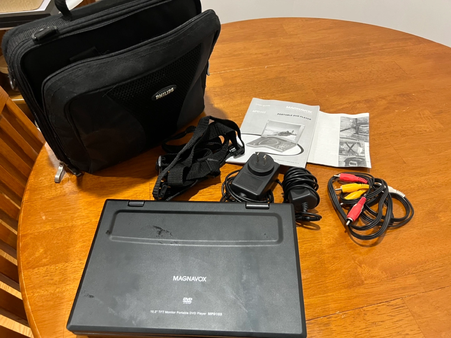 Portable DVD player with 10.2" screen. Includes carrying case, power adapter, and AV cables. Plays DVDs. Pre-owned.
