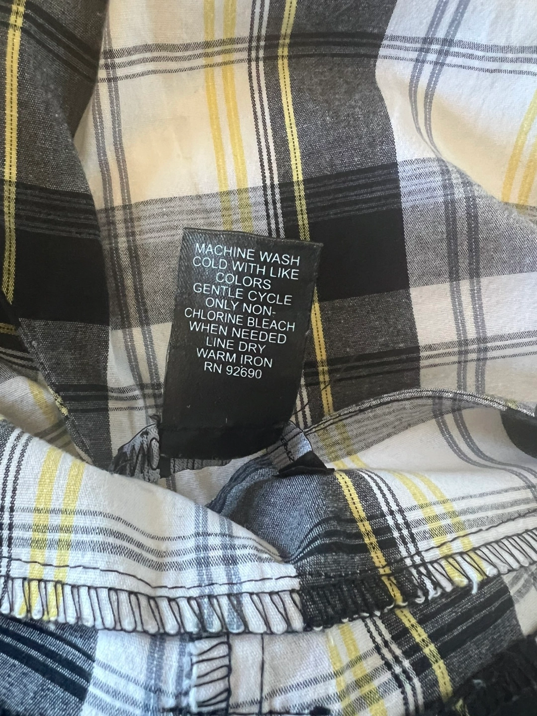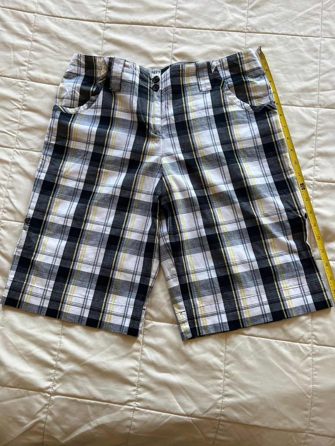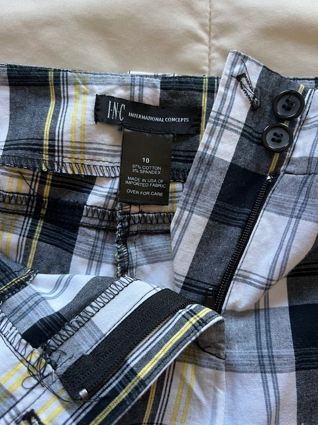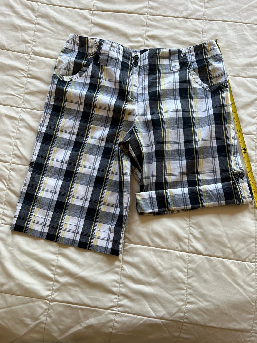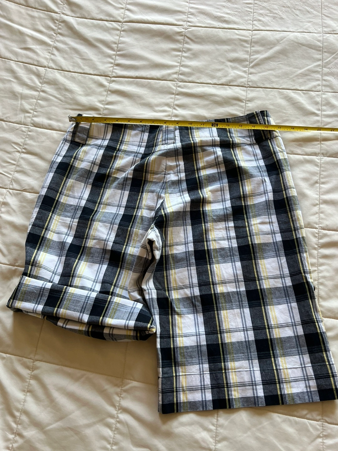 18Women's size 10 shorts. Black, white, and yellow plaid pattern. 97% cotton, 3% spandex. Machine washable.