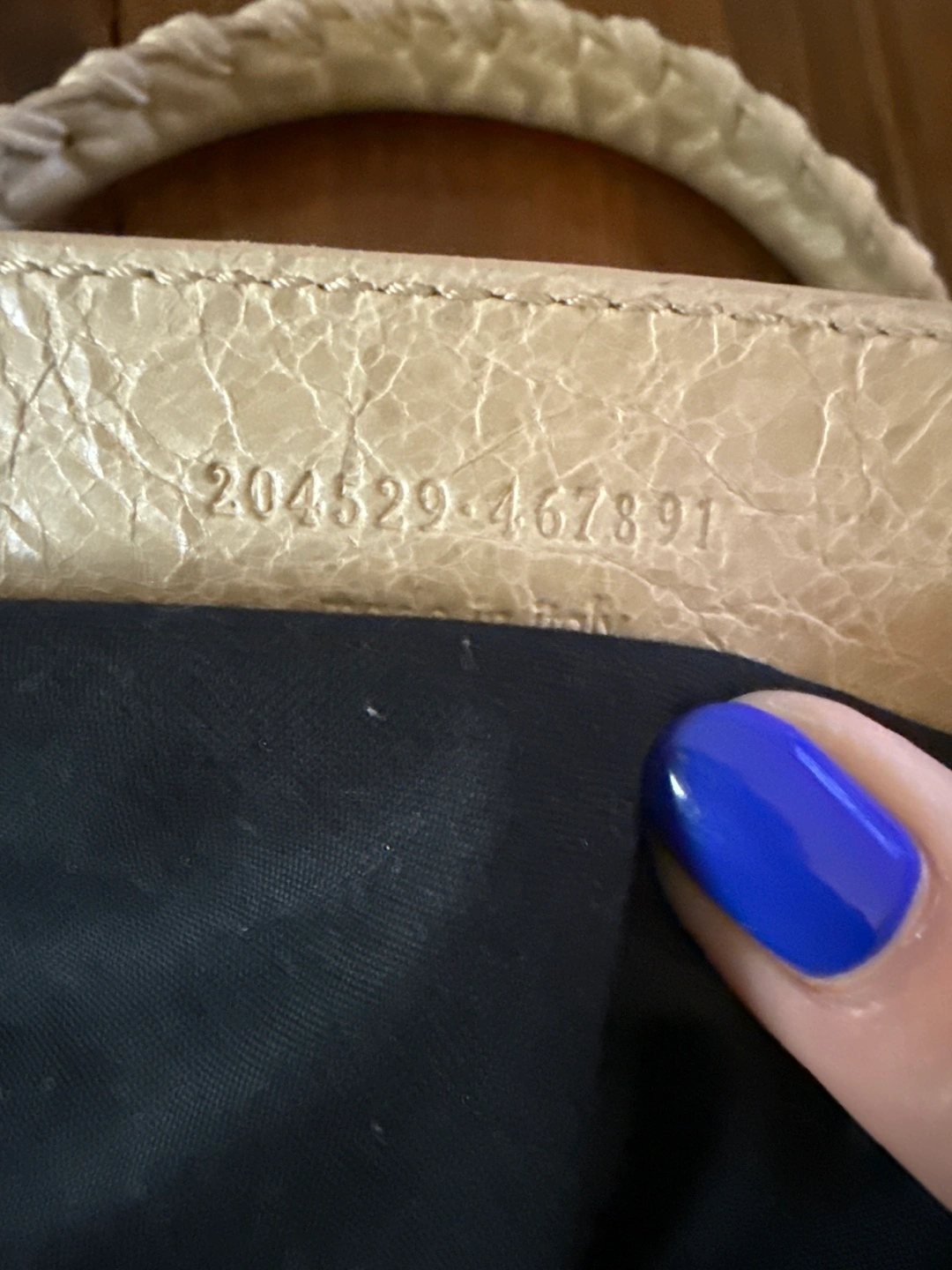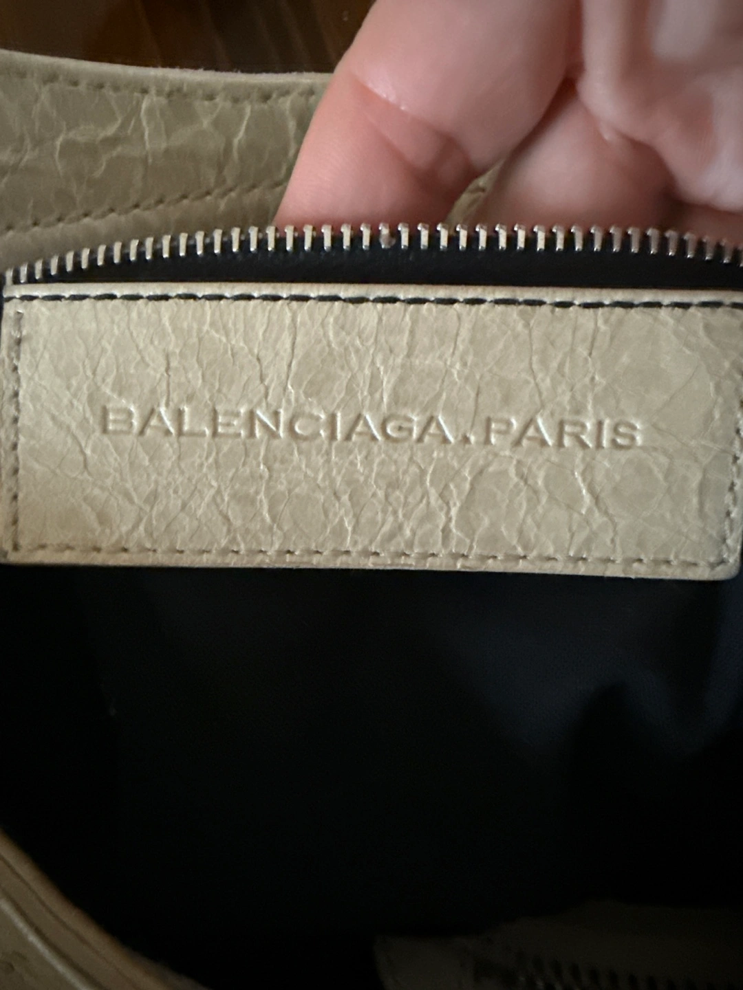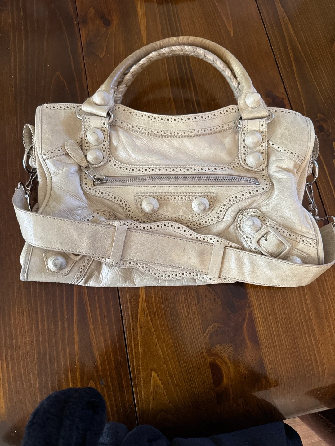 71Pre-loved Balenciaga City bag. Off-white leather. Features signature studs and perforated detailing. Includes shoulder strap. Shows some signs of wear. Authentic and loved