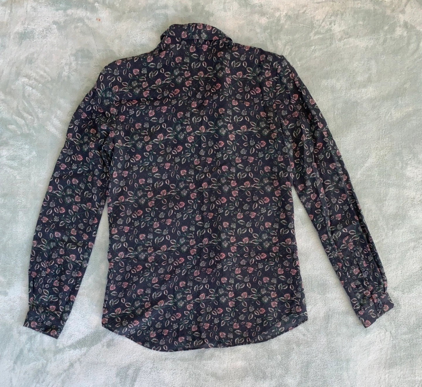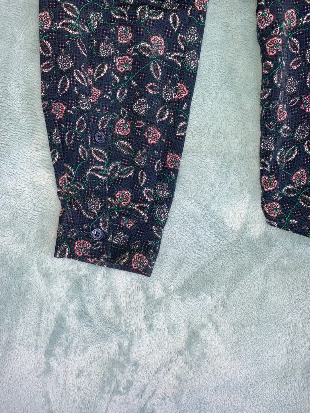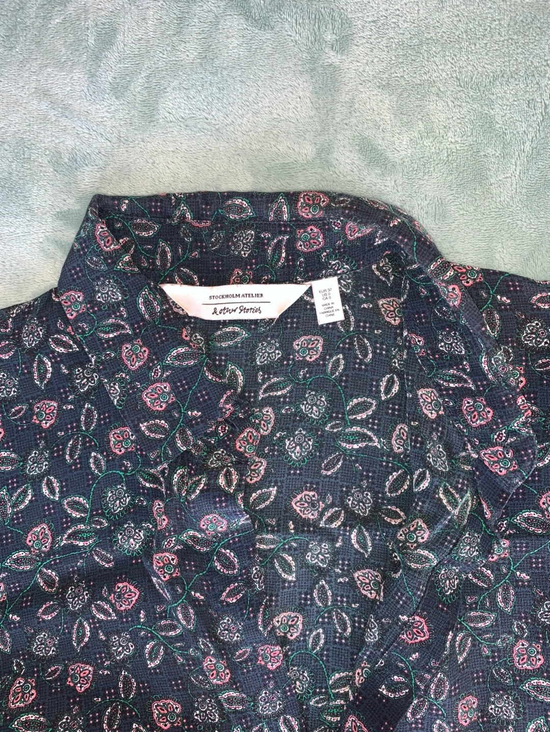 395Long sleeve button-down shirt. Dark floral print. Size 0. Excellent condition. 100% silk Machine wash cold