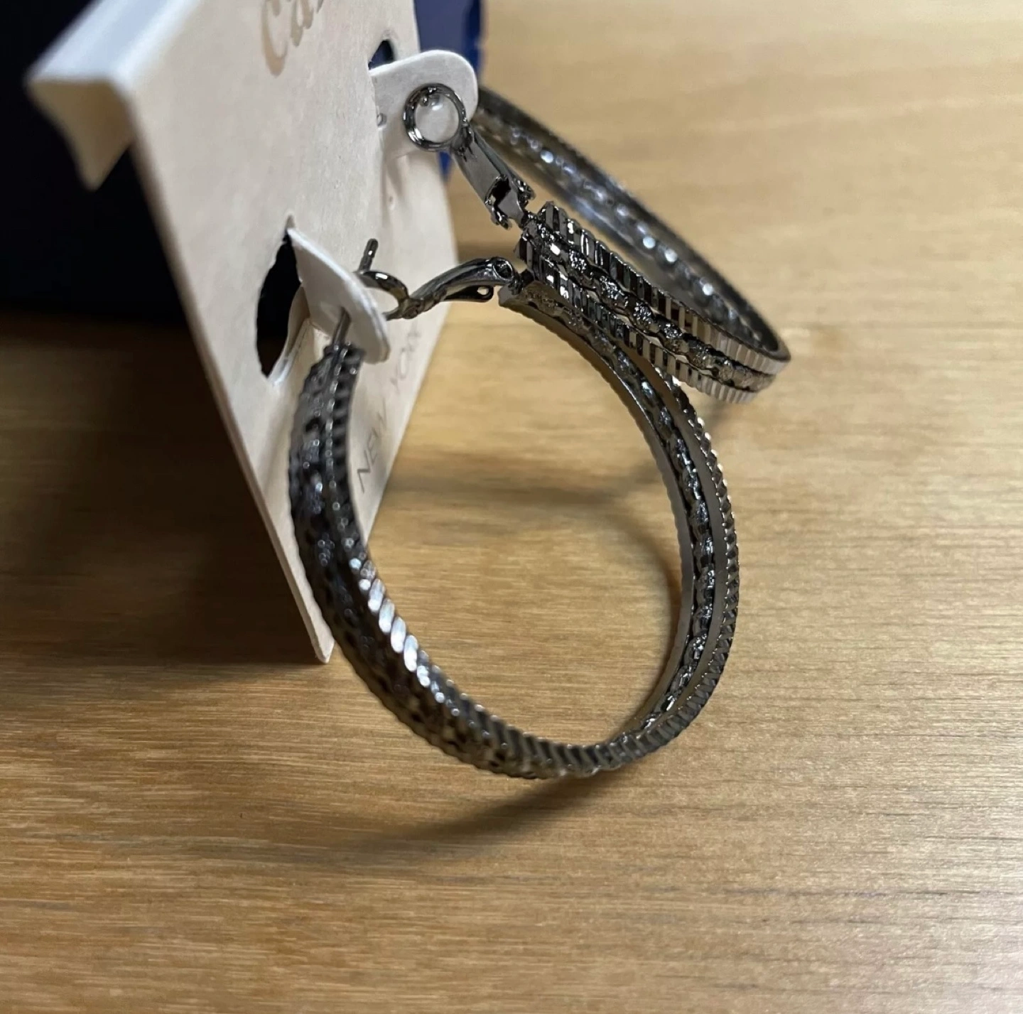 Pair of gunmetal gray hoop earrings. Hoops feature textured detailing.