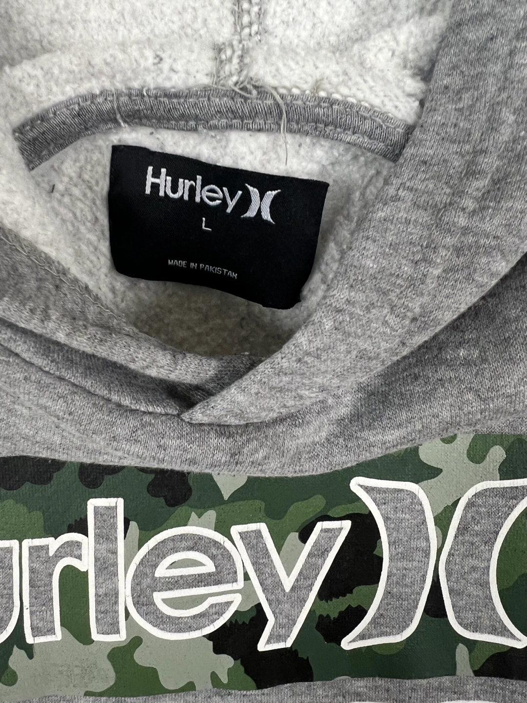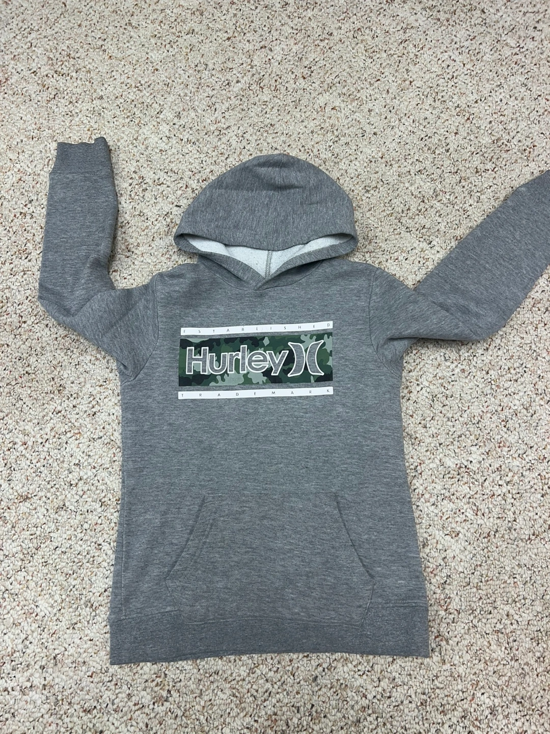 18Gray hooded sweatshirt. Size large. Features a camouflage print Hurley logo. Long sleeves. Kangaroo pocket.
