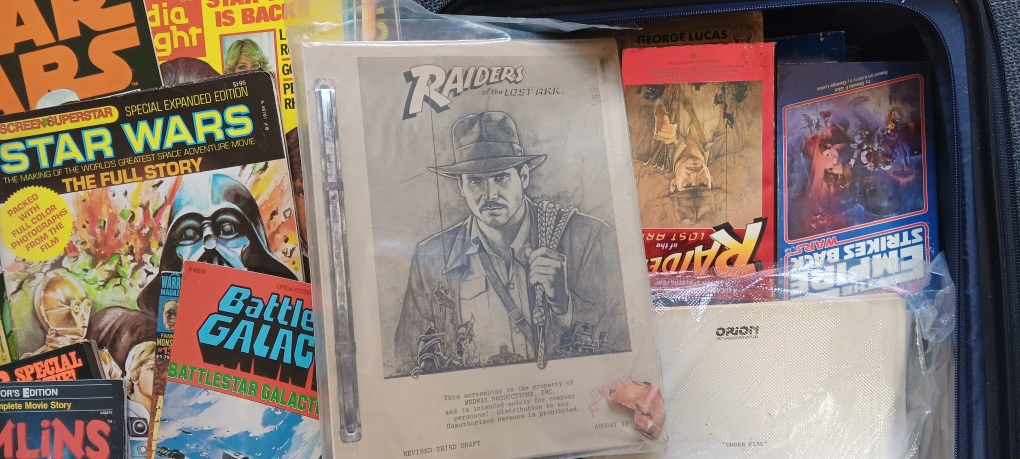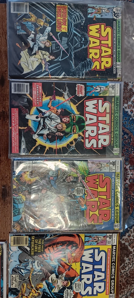 Collection of vintage Star Wars comic books and stickers,posters,and some otjer stuff too... some indiana jones stuff too, Marvel Comics Group. Issues include various numbers. Stickers feature Darth Vader and other characters.