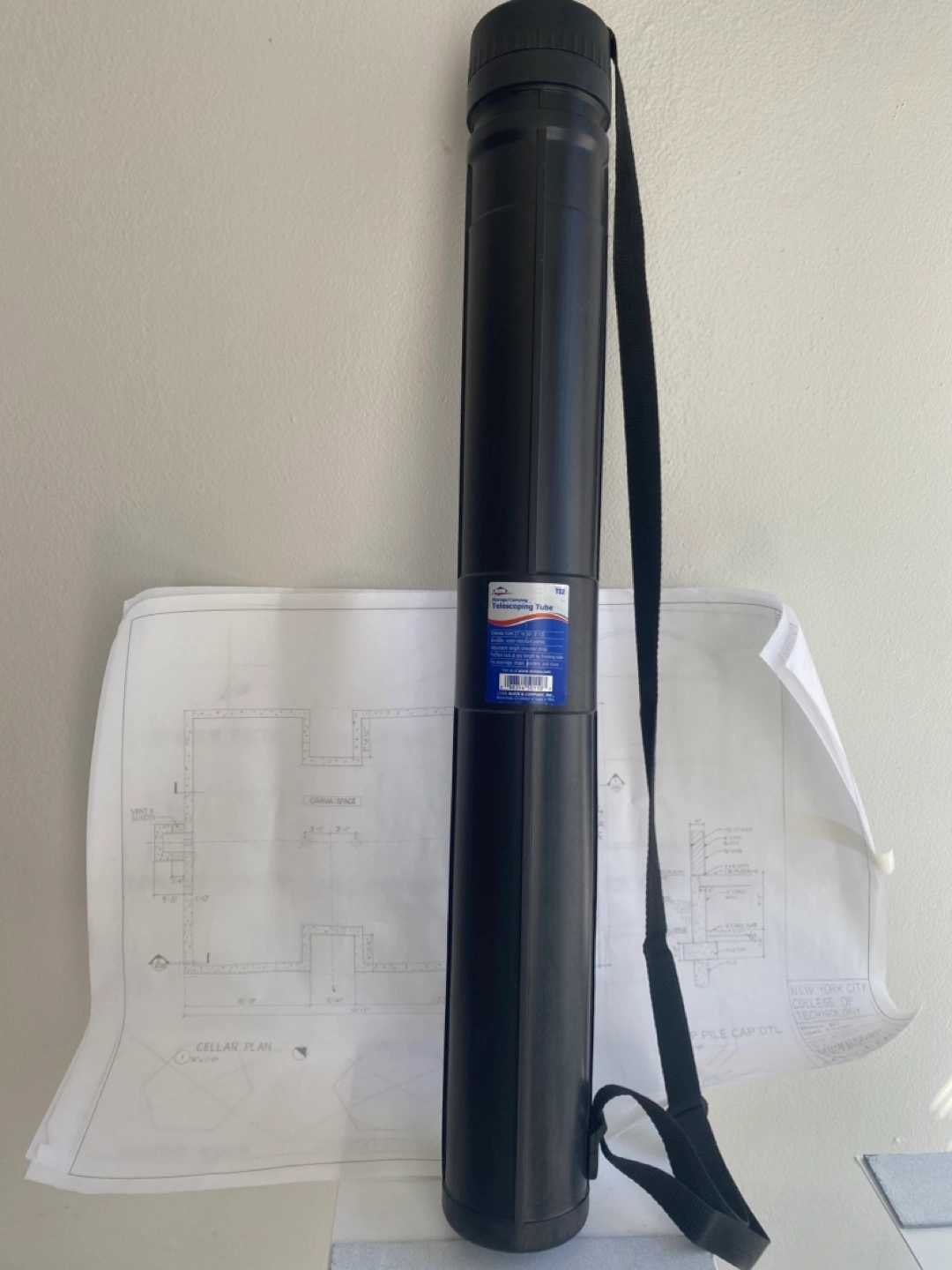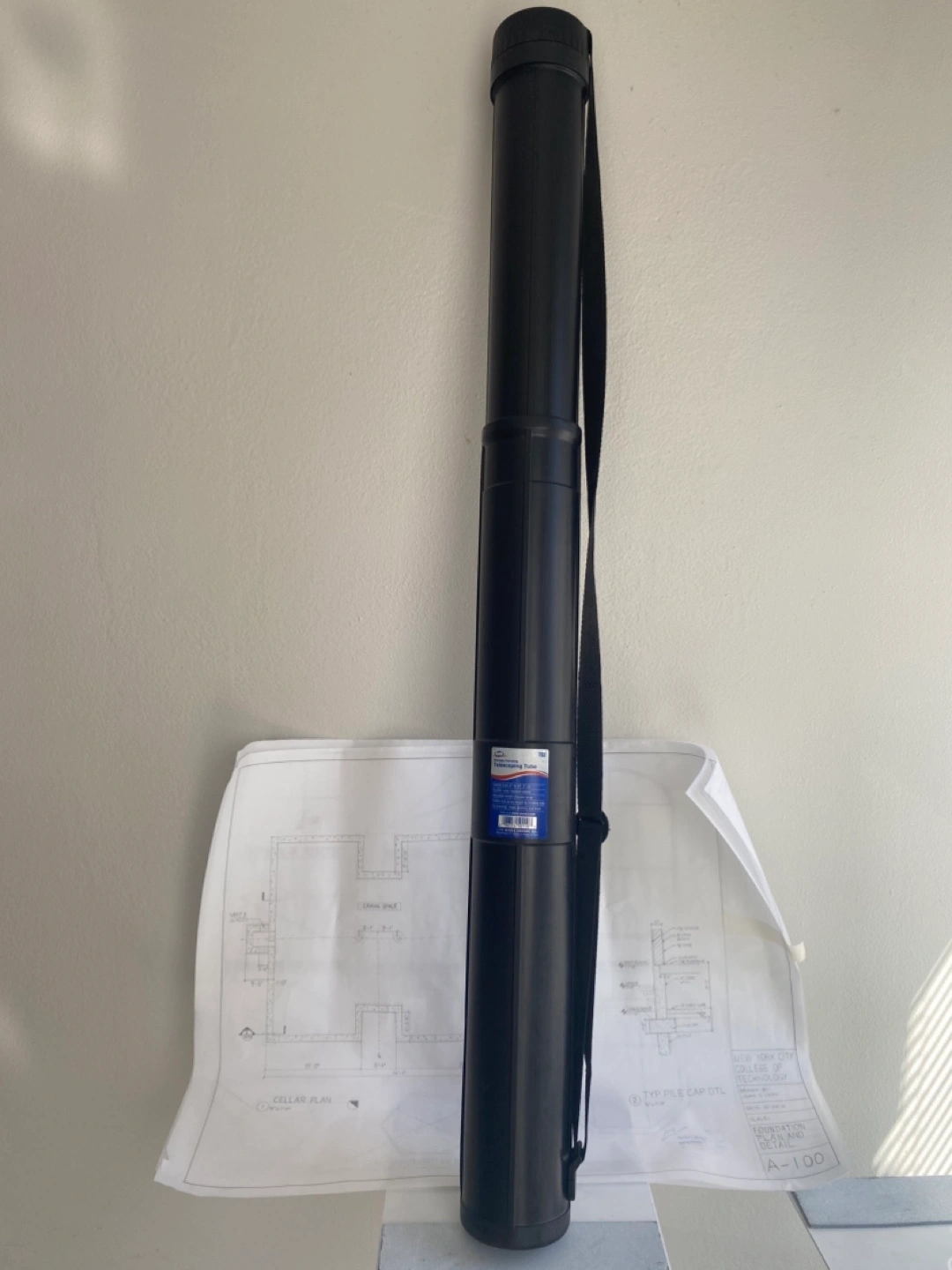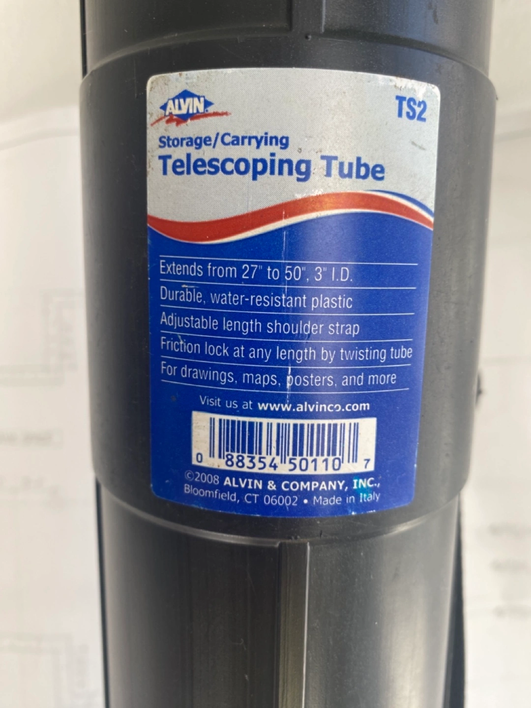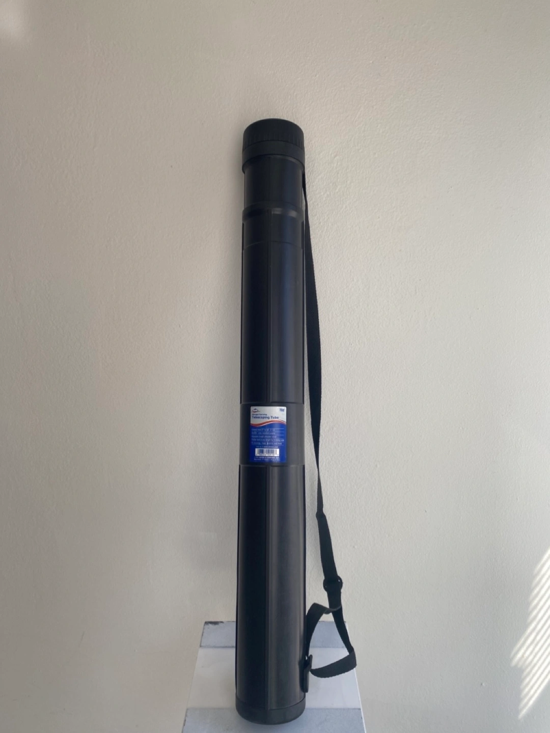 86Extends from 27’-50’. 3’ I.D. Durable, water-resistant plastic. Adjustable length shoulder strap. I secure twist-off screw cap. Friction lock at any length by twisting tube. Ideal for transporting, drawings, charts, maps, blueprints, posters etc. Cash and pickup deal only.