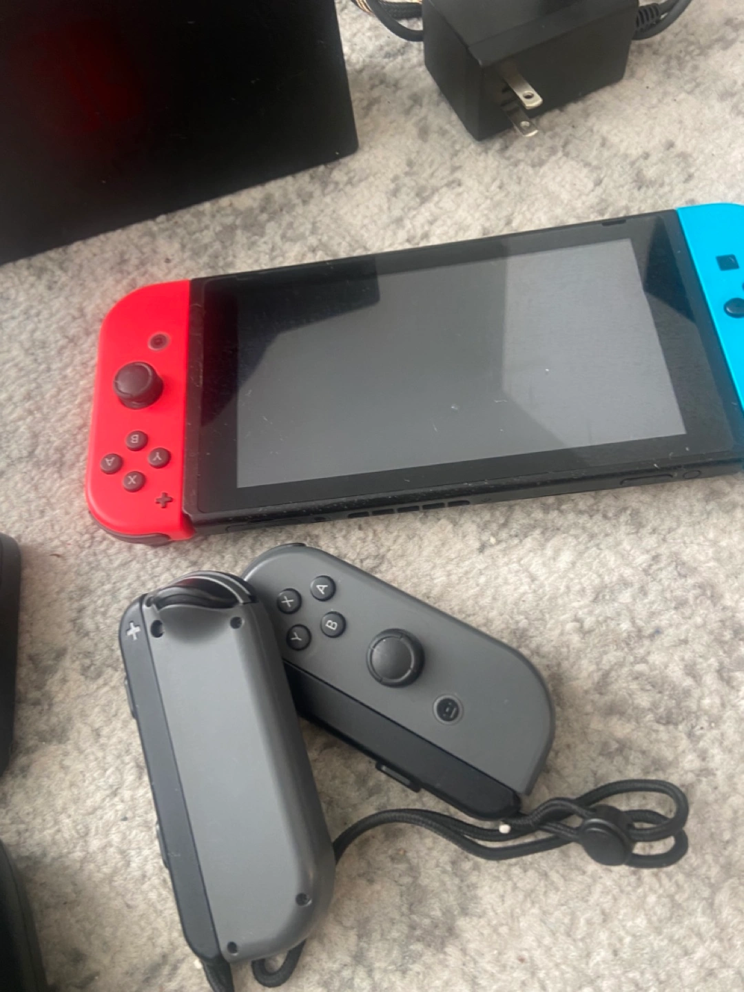 Nintendo Switch console, red and blue Joy-Cons, dock, extra gray Joy-Con pair, AC adapter, and two game cartridges. Used condition.