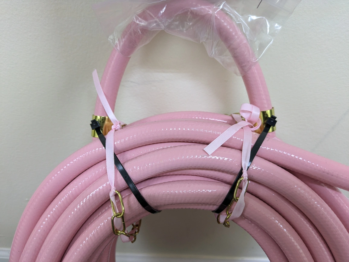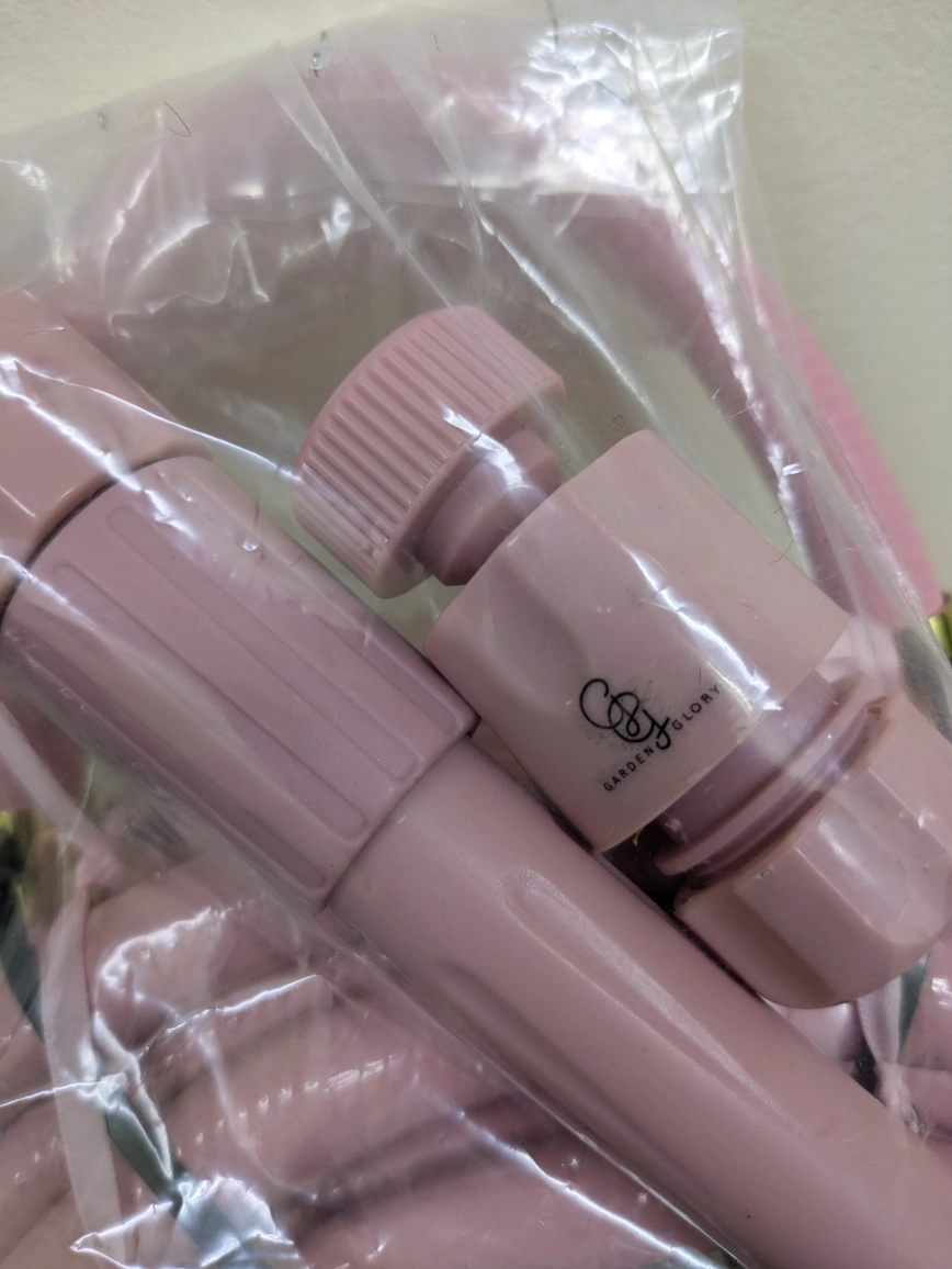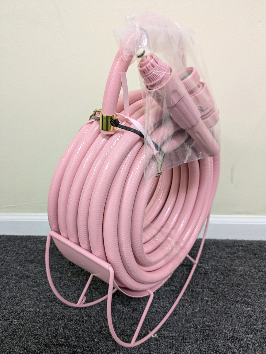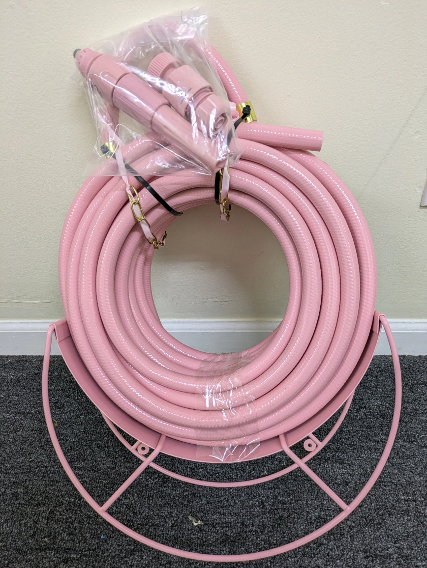 New pink garden hose. Includes a matching pink metal reel. Hose and nozzle are light pink. Comes in original packaging. Pink garden glory hose kit in excellent condition