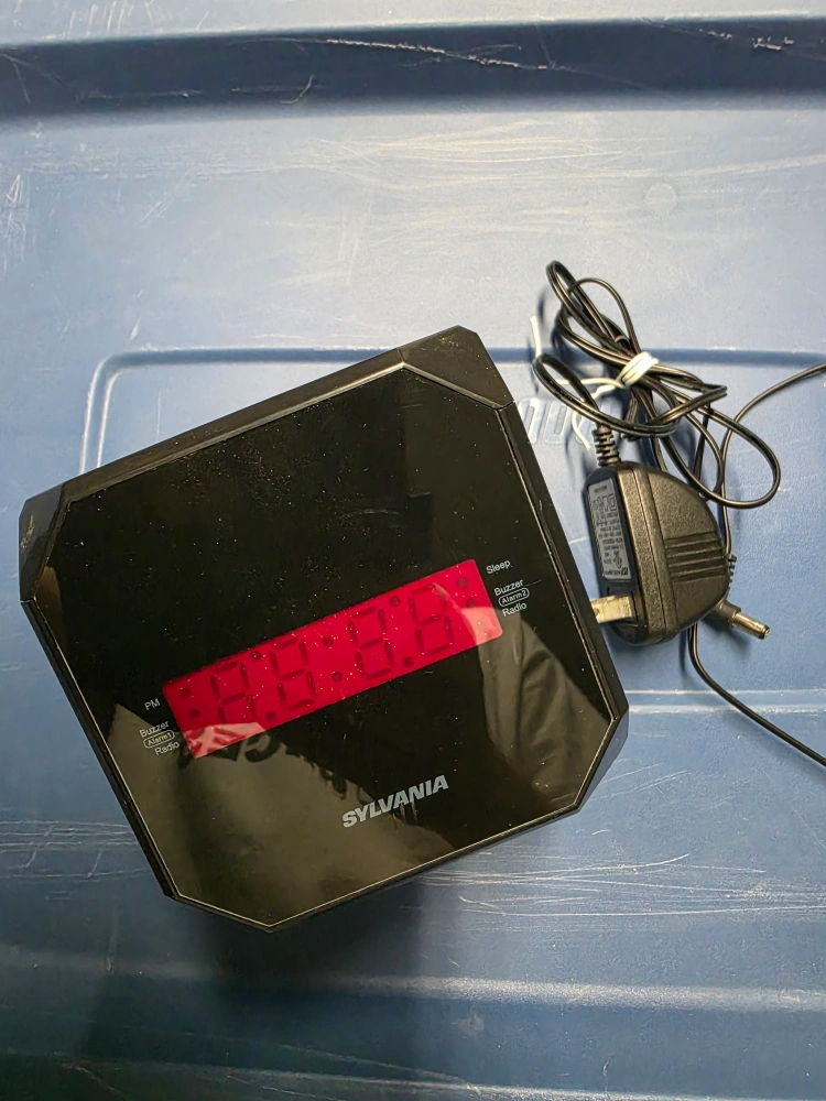 Black clock radio. Features large red LED display. Includes power adapter. Snooze and sleep functions. Used.
