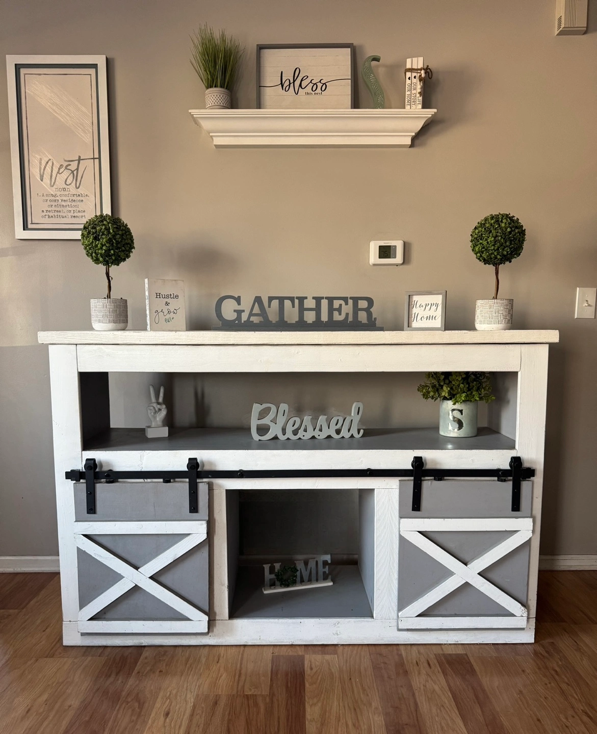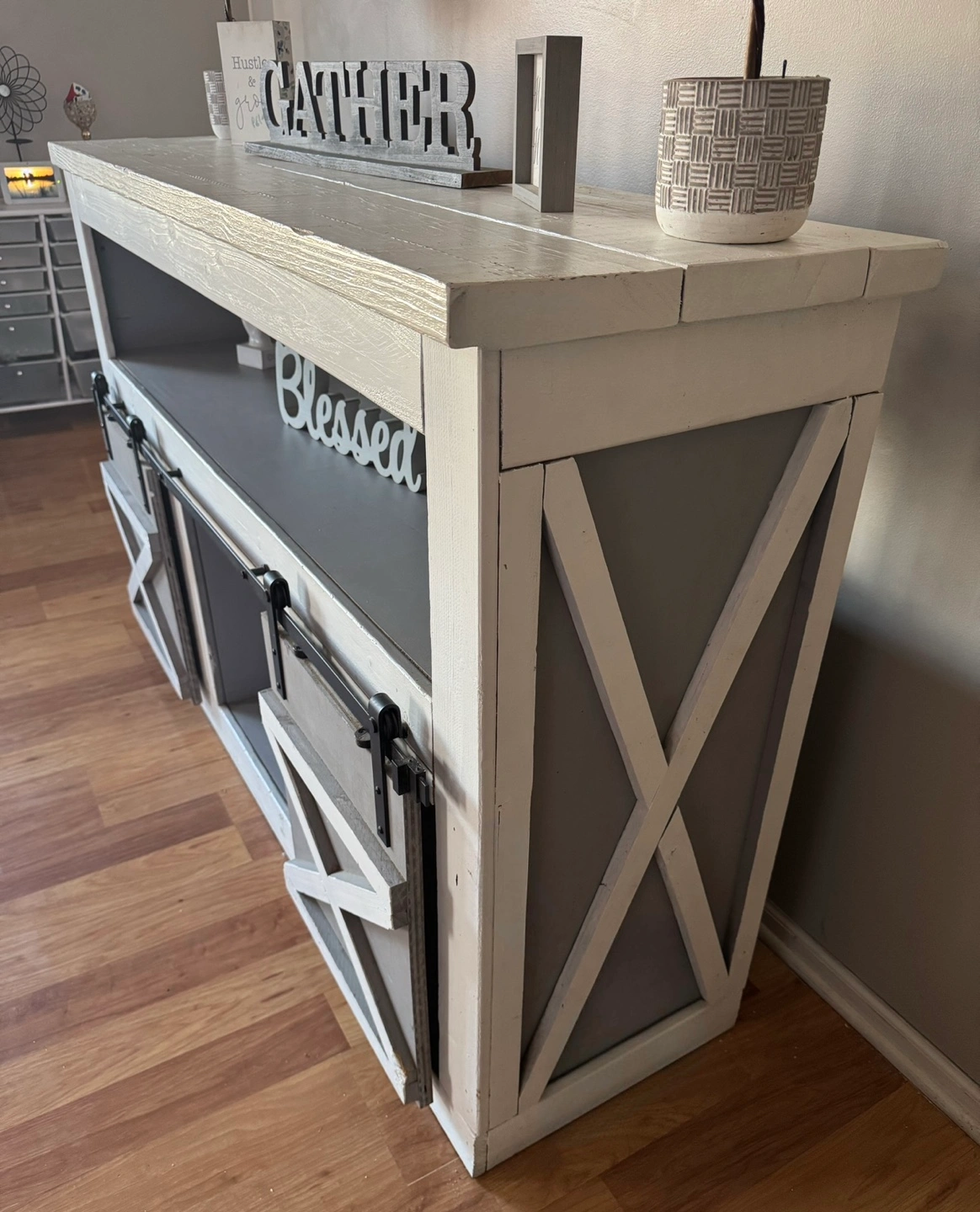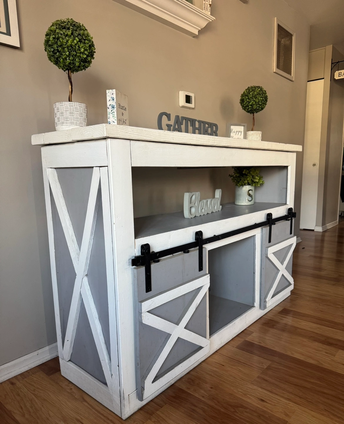 137✨Gorgeous white & gray farmstyle ,hand built solid wood tv stand, black hardware, both doors slide (barn doors) solid piece💪🏼this was originally my tv stand, but since we upgraded to a bigger tv & a bigger stand my husband also built, there’s no need for this one. This stand fit under the 70 inch tv nicely , it’s also been re touched up , Clean & sturdy! This is NOT that cheap wayfair/Ikea furniture, this will last you FOREVERR, I sell good quality furniture & my prices are still better/cheaper than a furniture store. Please don’t ask to lower my price‼️ ✨ Measurements; 40 inches tall 62 inches wide 18 inches deep FAST & EASY DRIVEWAY PICKUP IN LOCKPORT✅ BRING HELP IF YOU HAVE IT💪🏼OR WE CAN ASSIST HELP AFTER 4P.M MON-FRI‼️ CASH ONLY‼️ BRING EXACT CHANGE PLEASE‼️$50 DEPOSIT WITH ZELLE & ITS COMPLETELY YOURS‼️ (DECOR NOT INCLUDED)‼️ CHECKOUT MY OTHER LISTINGS 😁 ✨Feel free to follow me for more upcoming furniture & I definitely appreciate you for following me! 🤝✨