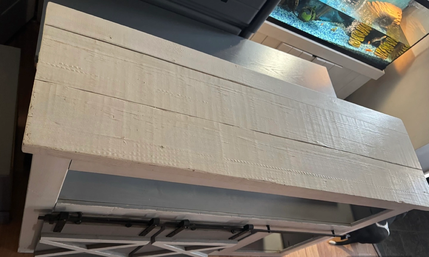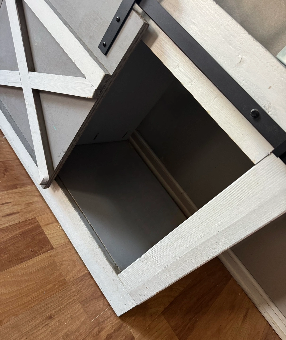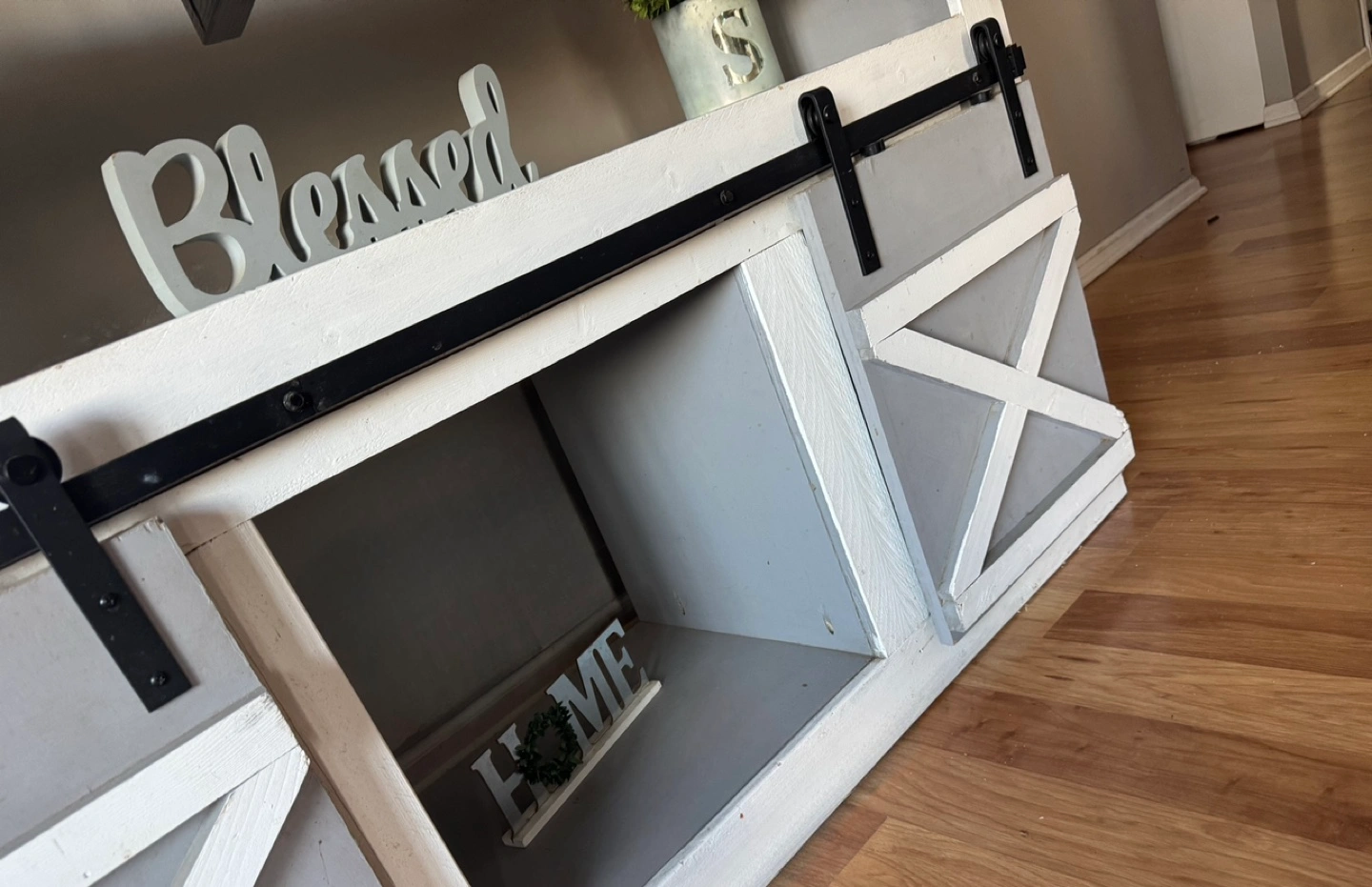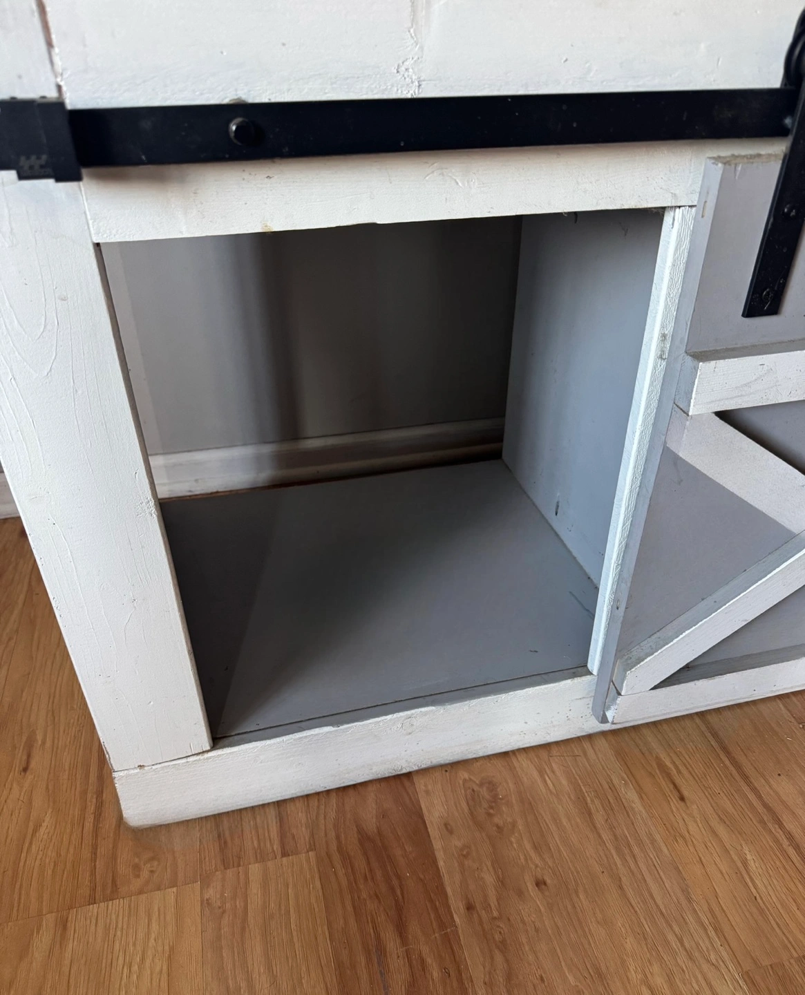 137✨Gorgeous white & gray farmstyle ,hand built solid wood tv stand, black hardware, both doors slide (barn doors) solid piece💪🏼this was originally my tv stand, but since we upgraded to a bigger tv & a bigger stand my husband also built, there’s no need for this one. This stand fit under the 70 inch tv nicely , it’s also been re touched up , Clean & sturdy! This is NOT that cheap wayfair/Ikea furniture, this will last you FOREVERR, I sell good quality furniture & my prices are still better/cheaper than a furniture store. Please don’t ask to lower my price‼️ ✨ Measurements; 40 inches tall 62 inches wide 18 inches deep FAST & EASY DRIVEWAY PICKUP IN LOCKPORT✅ BRING HELP IF YOU HAVE IT💪🏼OR WE CAN ASSIST HELP AFTER 4P.M MON-FRI‼️ CASH ONLY‼️ BRING EXACT CHANGE PLEASE‼️$50 DEPOSIT WITH ZELLE & ITS COMPLETELY YOURS‼️ (DECOR NOT INCLUDED)‼️ CHECKOUT MY OTHER LISTINGS 😁 ✨Feel free to follow me for more upcoming furniture & I definitely appreciate you for following me! 🤝✨