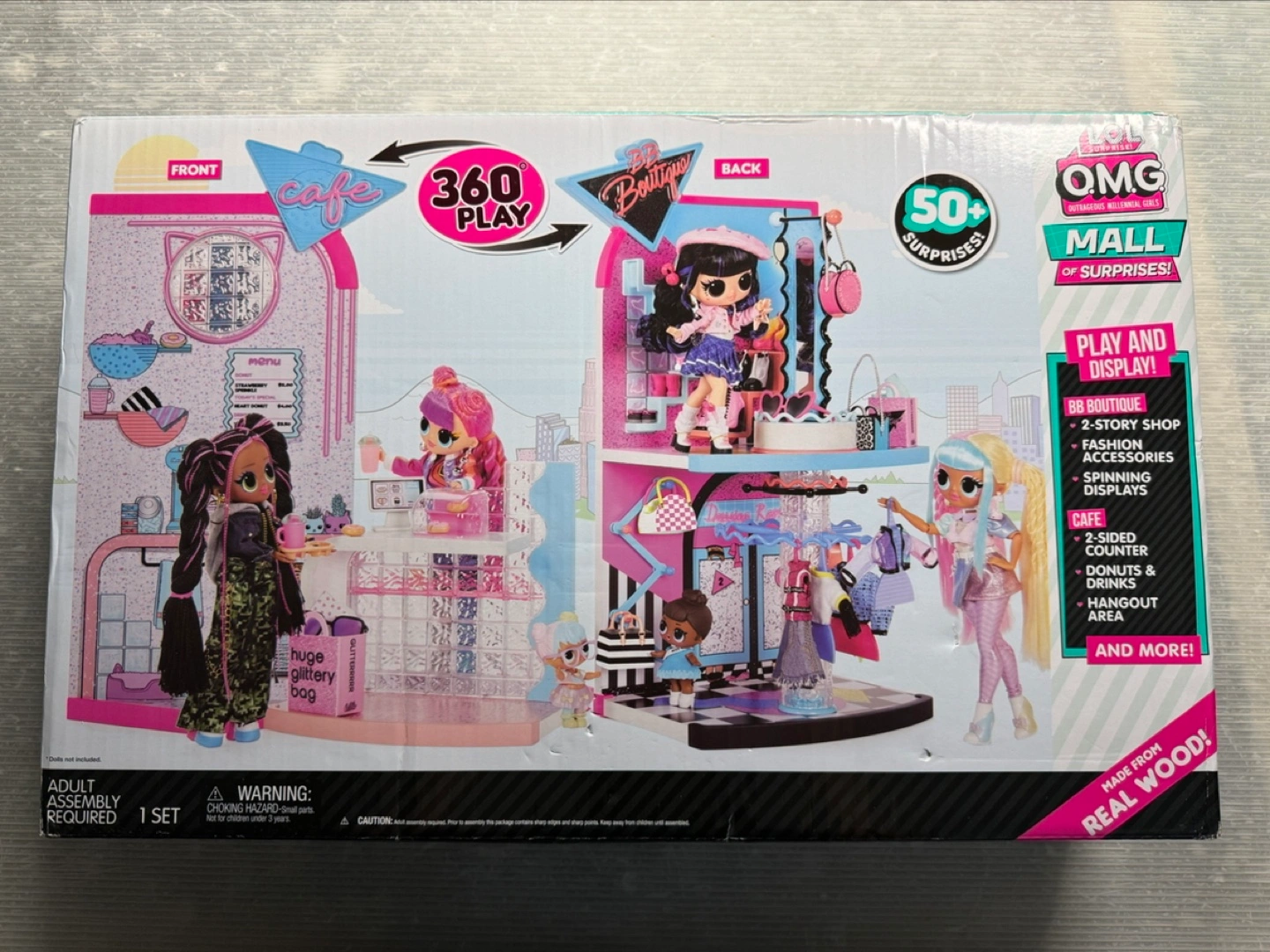 factory sealed box. Large 2-story playset. Features fashion shop, accessories, spinning displays, cafe, 3-sided counter, donuts & drinks, hangout area, and more. 50+ surprises included. Made from real wood. Adult assembly required.