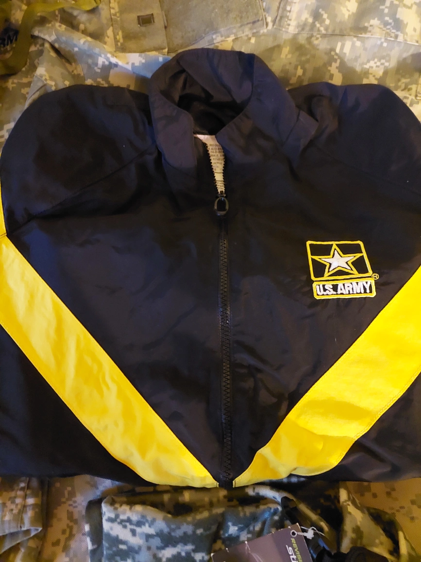 I'm giving this away because I want someone to enjoy it I'm trying to create new space. It's a Lightweight jacket. Black with yellow stripes. Full zip closure. US Army logo.