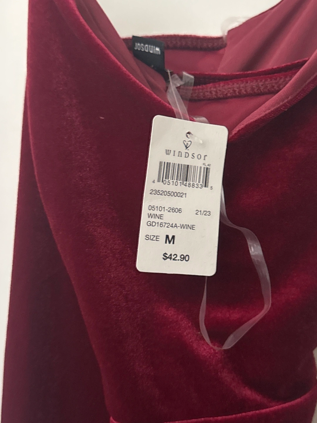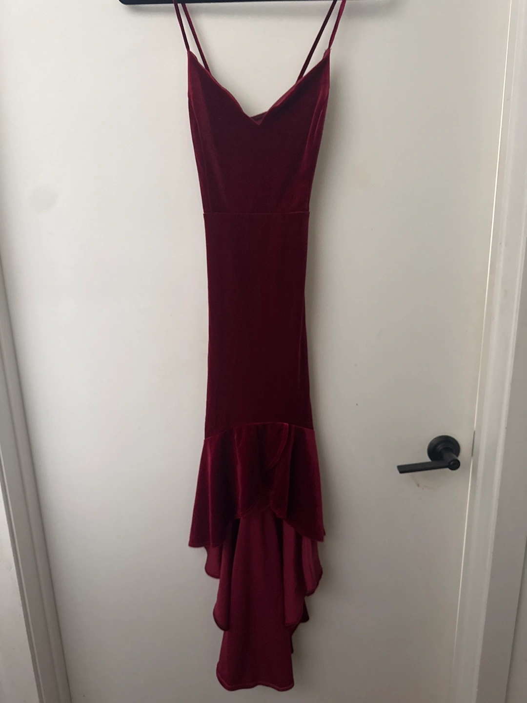 Burgundy velvet midi dress. High-low hemline. Spaghetti straps. Size medium. Excellent condition.