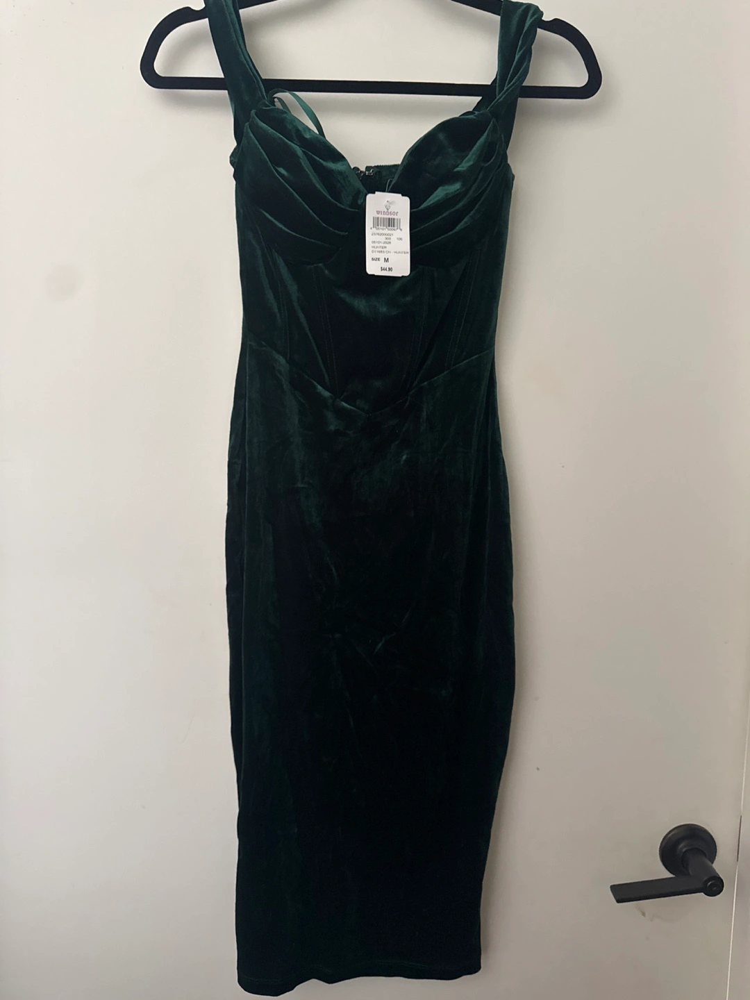 56Dark green velvet midi dress. Features a sweetheart neckline and shoulder straps. Form-fitting silhouette. Size small.
