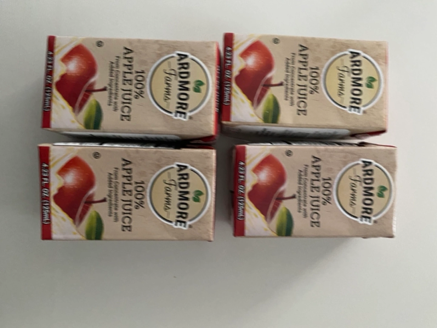 Four individual boxes of Ardmore Farms 100% Apple Juice. Small boxes, perfect for lunchboxes or snacks. Best if used by dates visible on the images. #freecycle