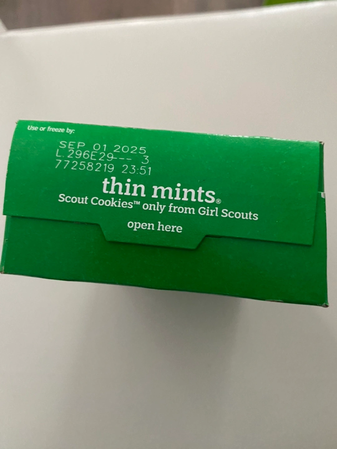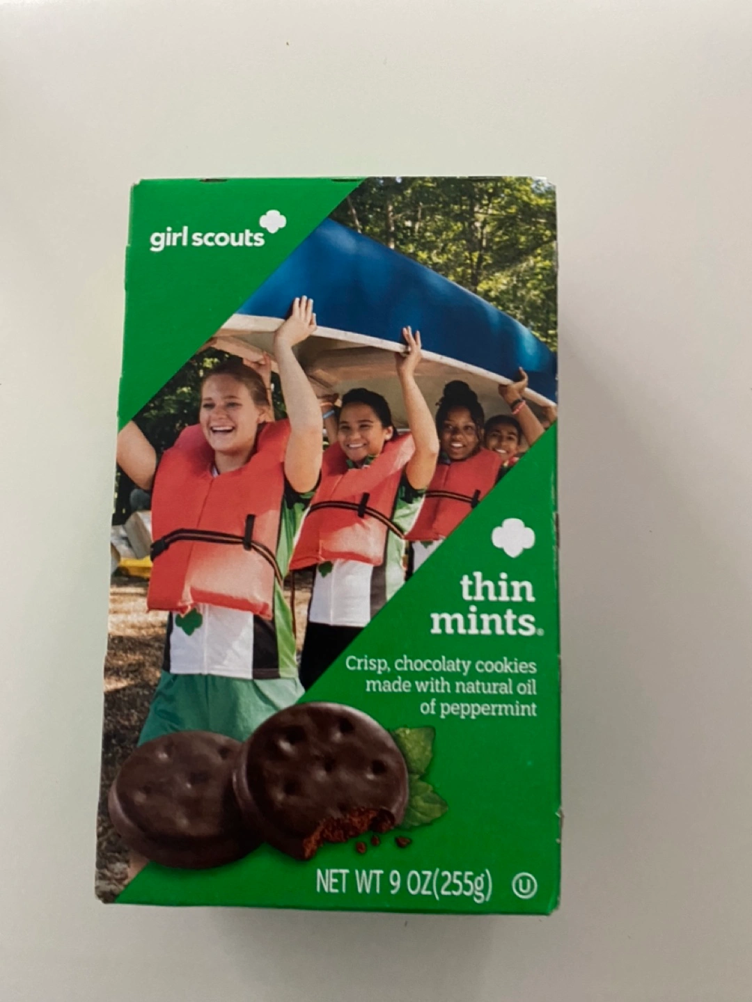453Box of Girl Scout Thin Mints cookies. Crisp, chocolaty cookies made with natural peppermint oil. Net weight 9 oz (255g). Use or freeze by September 1, 2025. New #freecycle