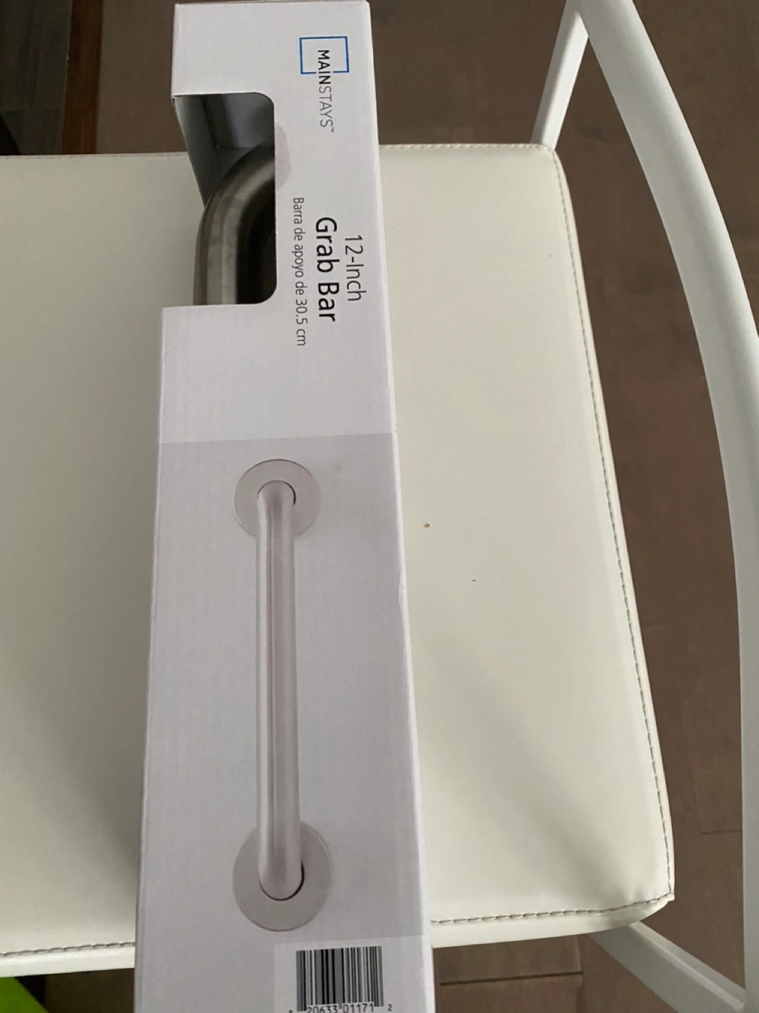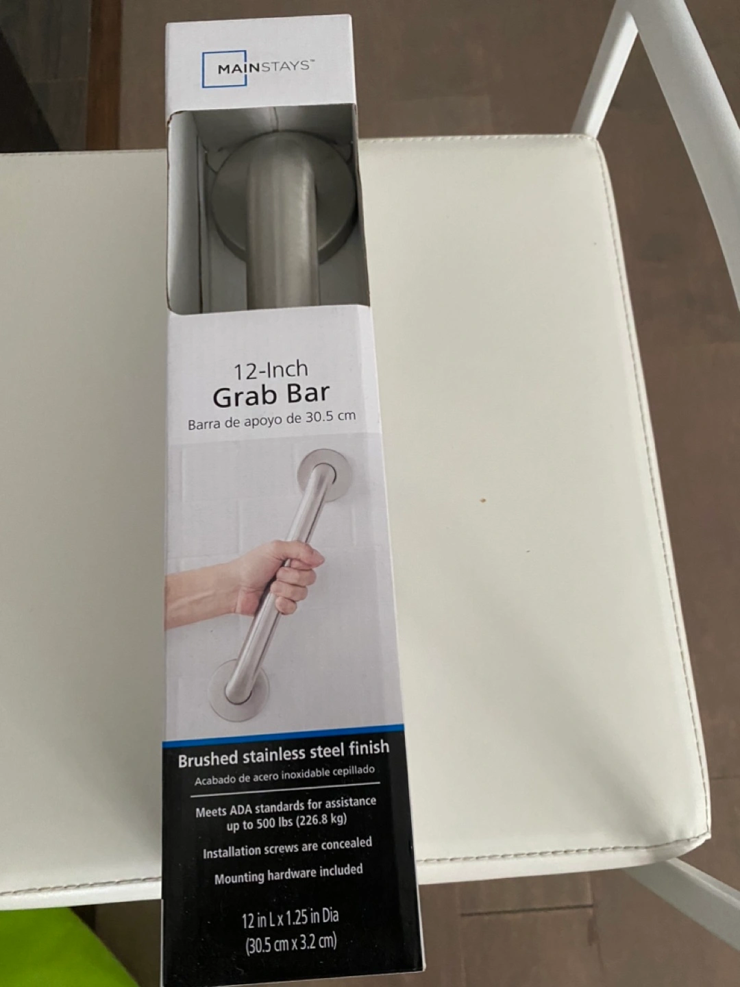 New in box. 12-inch grab bar. Brushed stainless steel finish. Meets ADA standards. Concealed installation screws. Mounting hardware included.