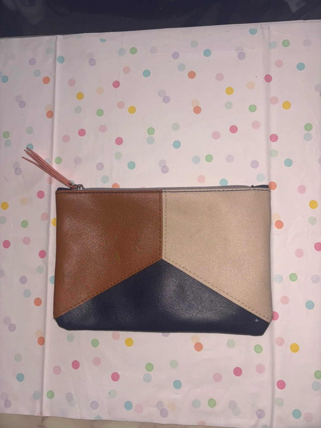 1000+Small zipper pouch. Three-color design. Leather-like material. Perfect for makeup or small accessories.