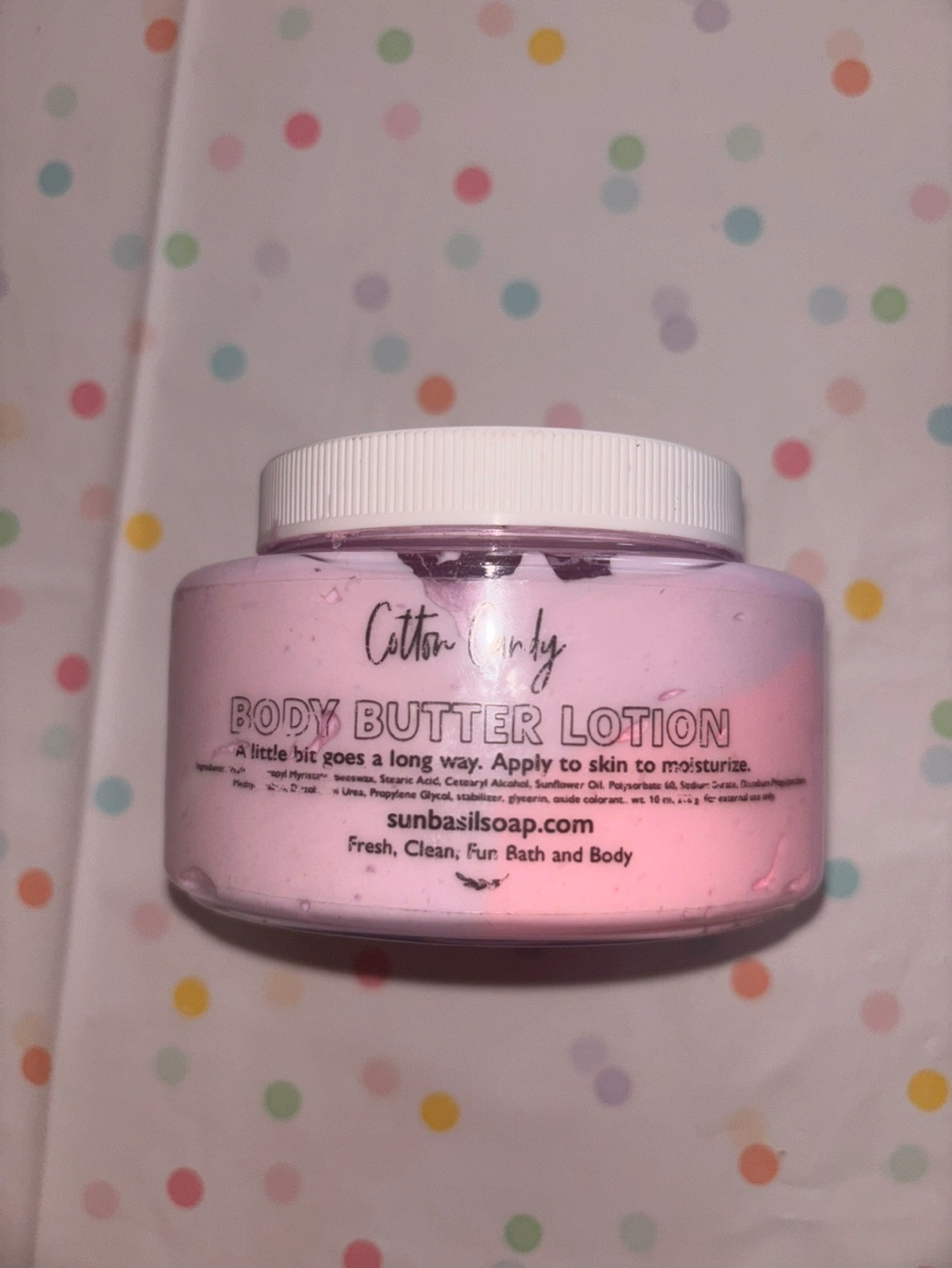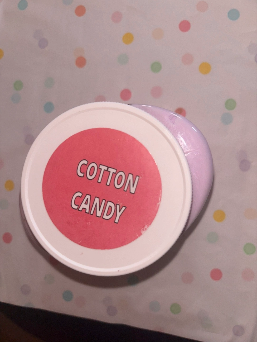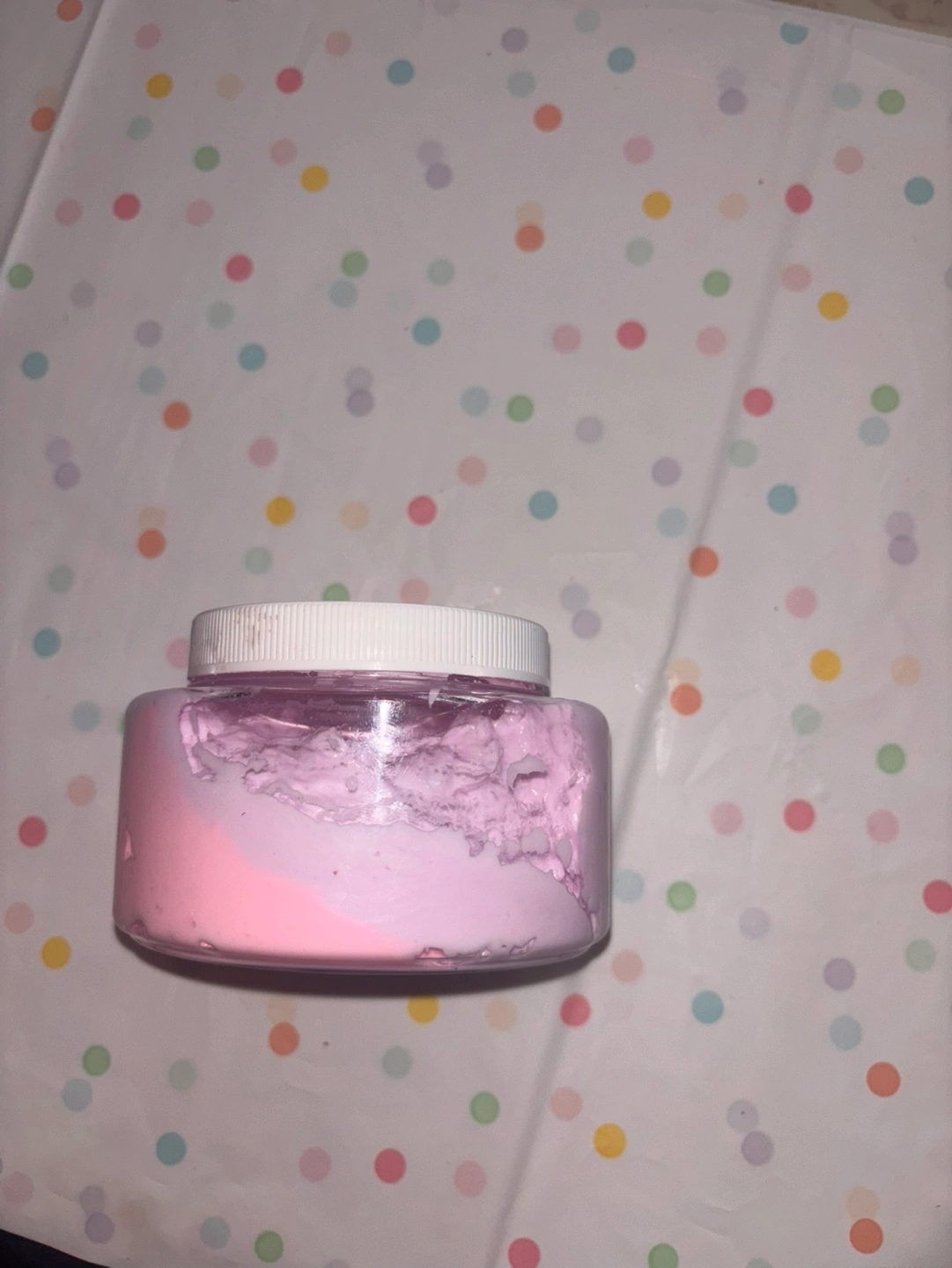 1000+Pink and purple body butter lotion in a clear jar with a white lid. Sweet cotton candy scent. Fun bath and body product. Smells great but not for me. Only used twice.
