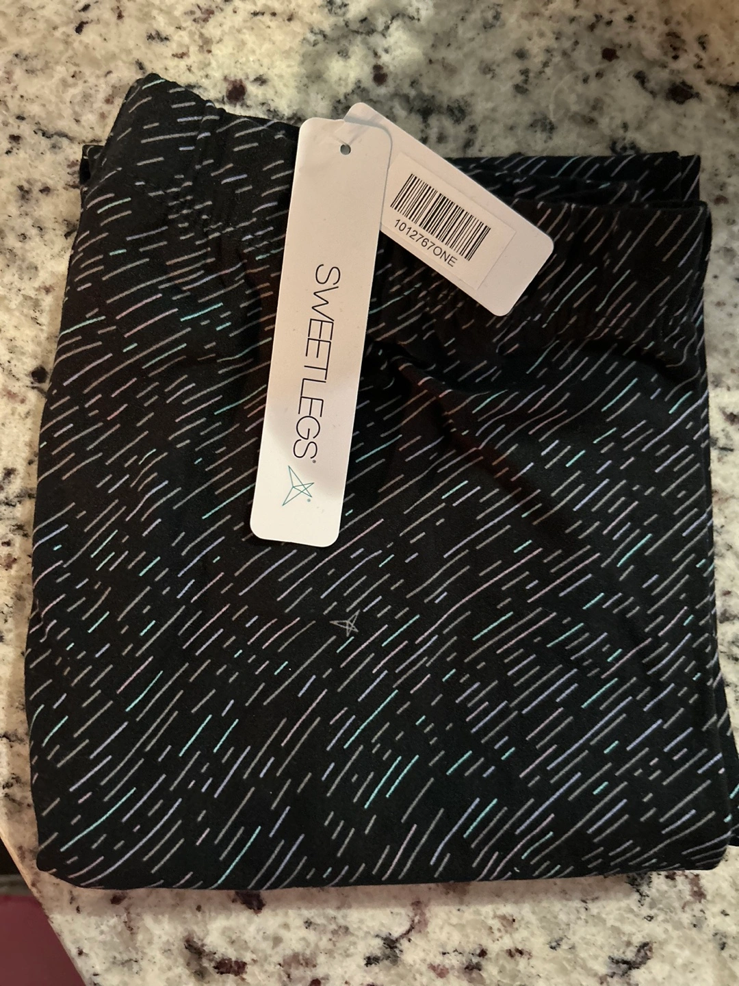 Brand new with tags SweetLegs leggings. Size One. Black base colour with thin, multicoloured lines. Buttery Soft and stretchy material. Perfect for everyday wear.