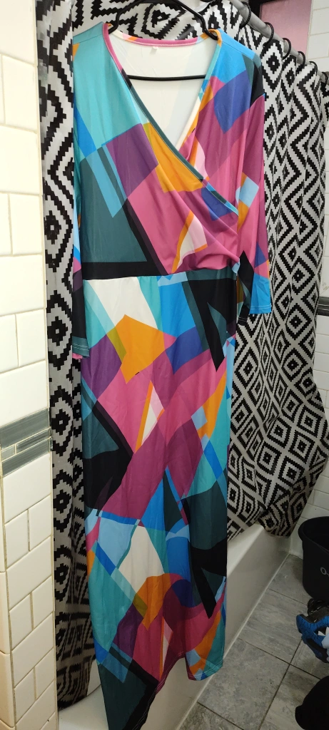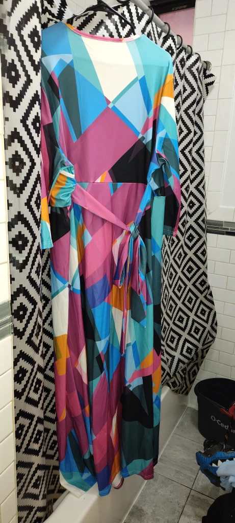 135Women's long sleeve maxi dress. Abstract geometric print. Wrap style. Three-quarter sleeves. Bright colors.