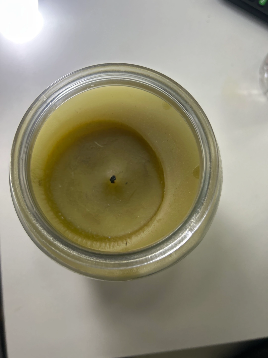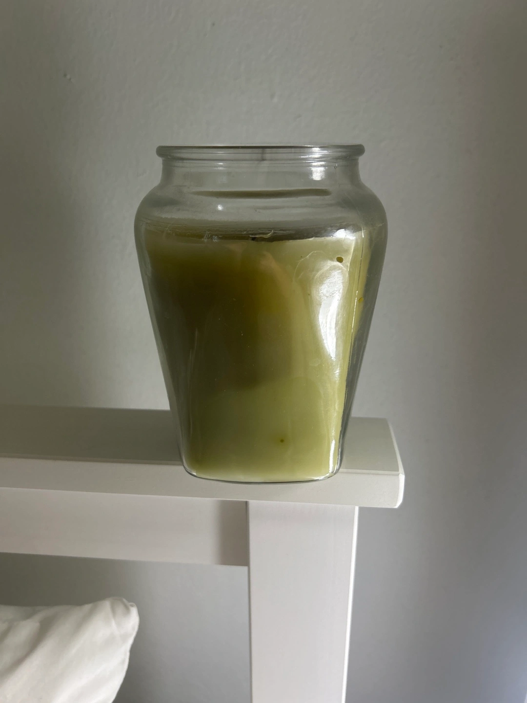 1000+Partially used candle. Olive green wax in a clear glass jar. Nice scent.