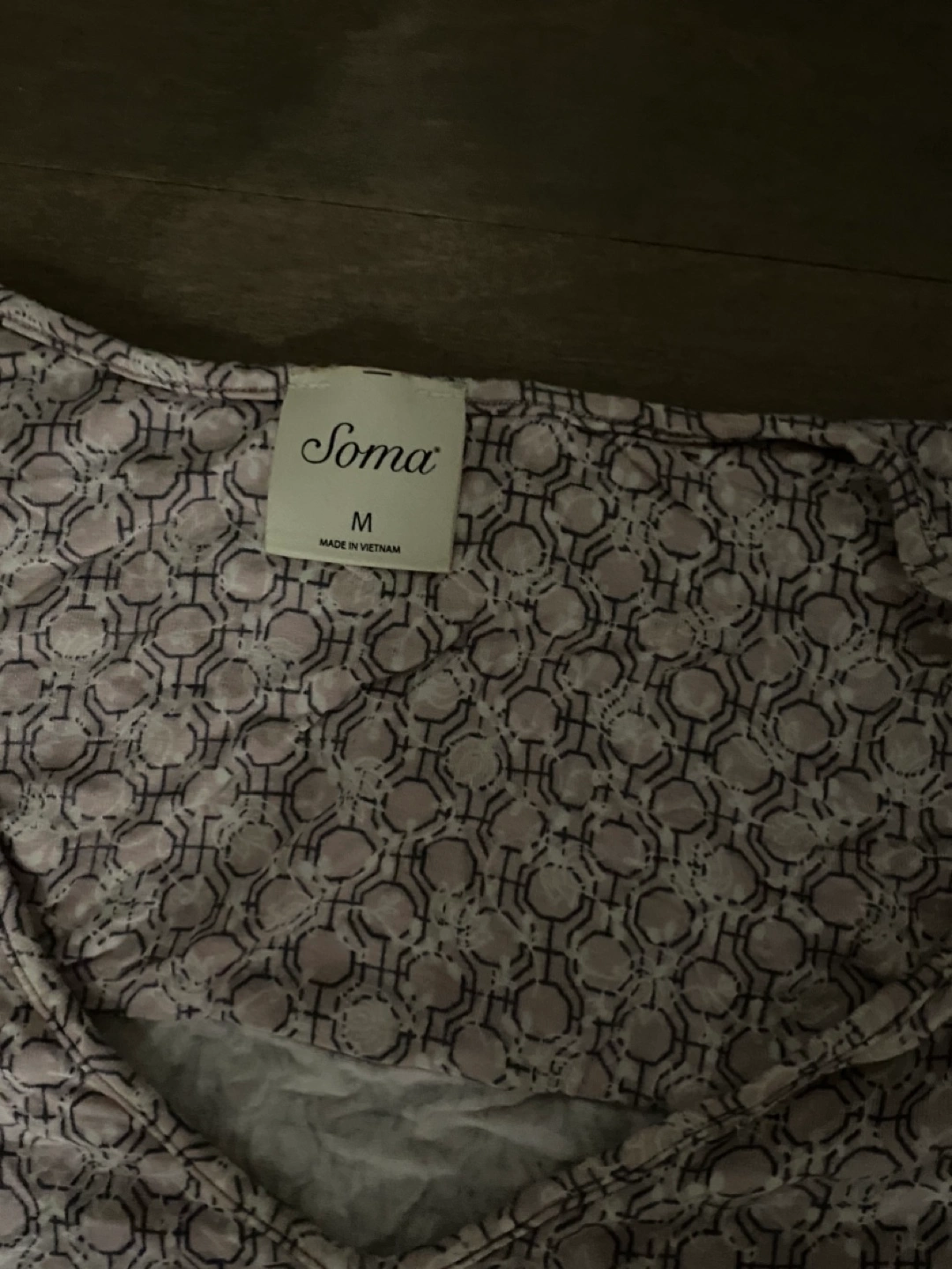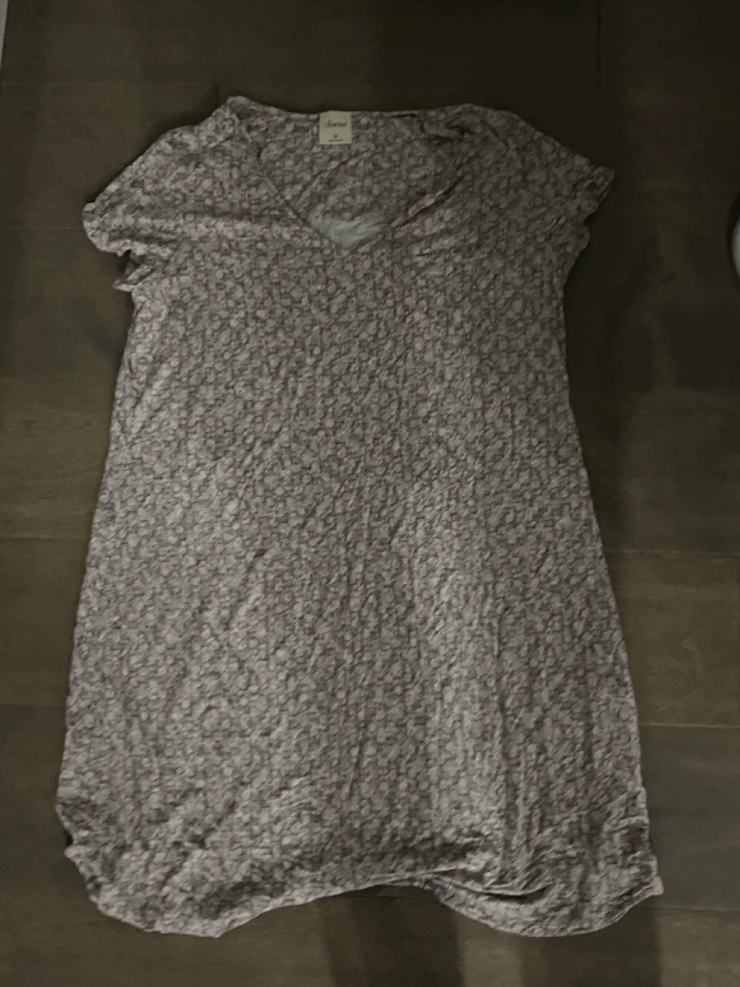 Purple and white floral print. V-neck. Short sleeves. Lightweight material. Medium size.