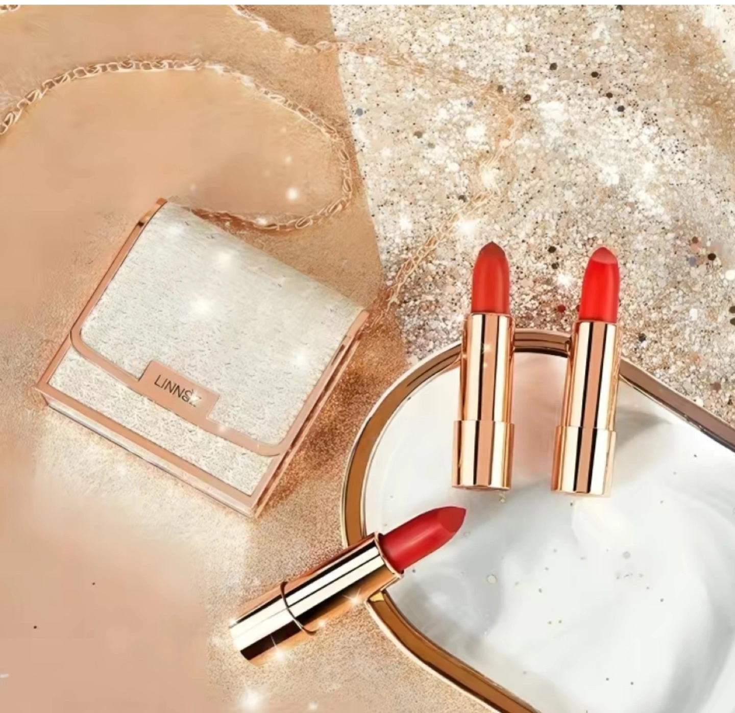 Three lipsticks in a sparkly chain bag. Rose gold accents. Perfect gift.