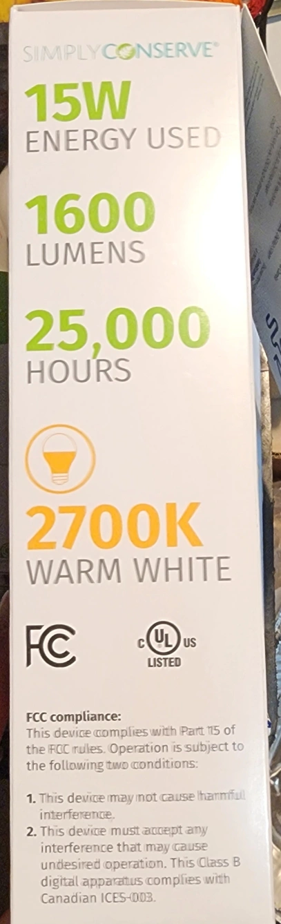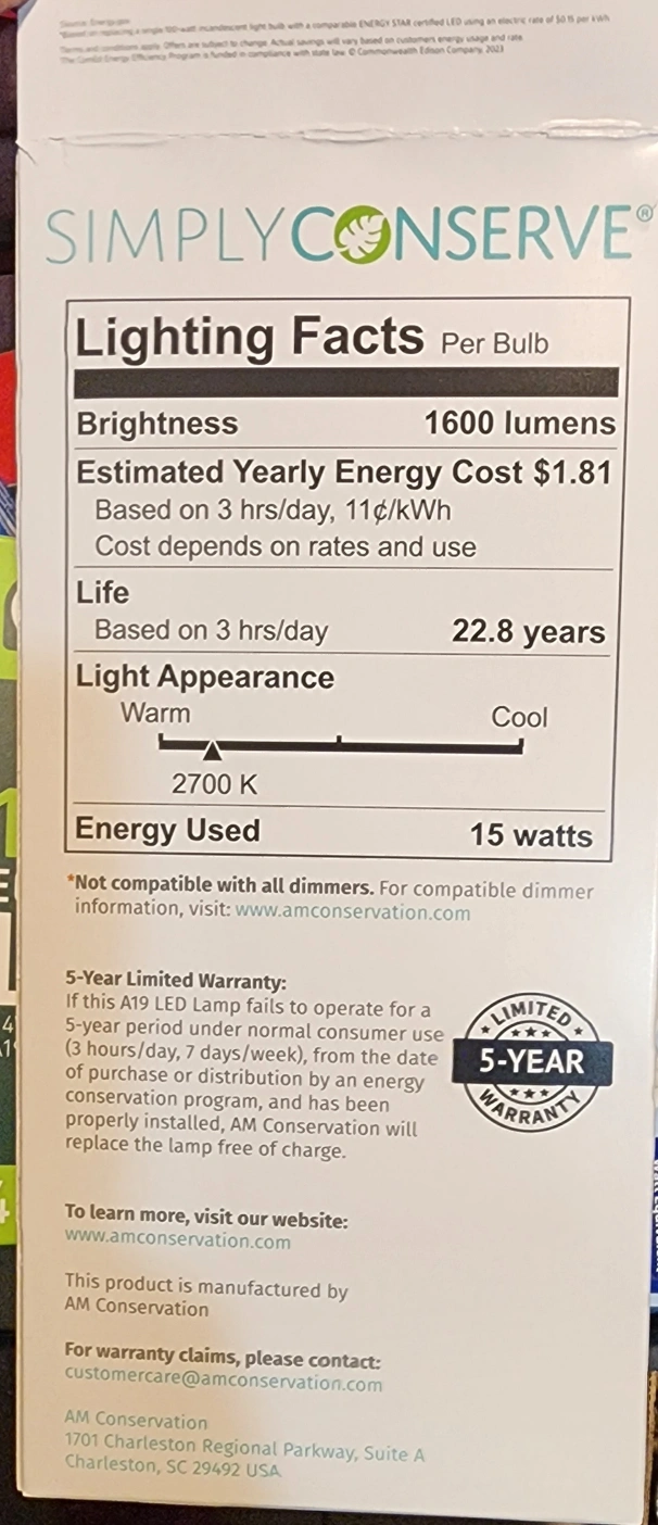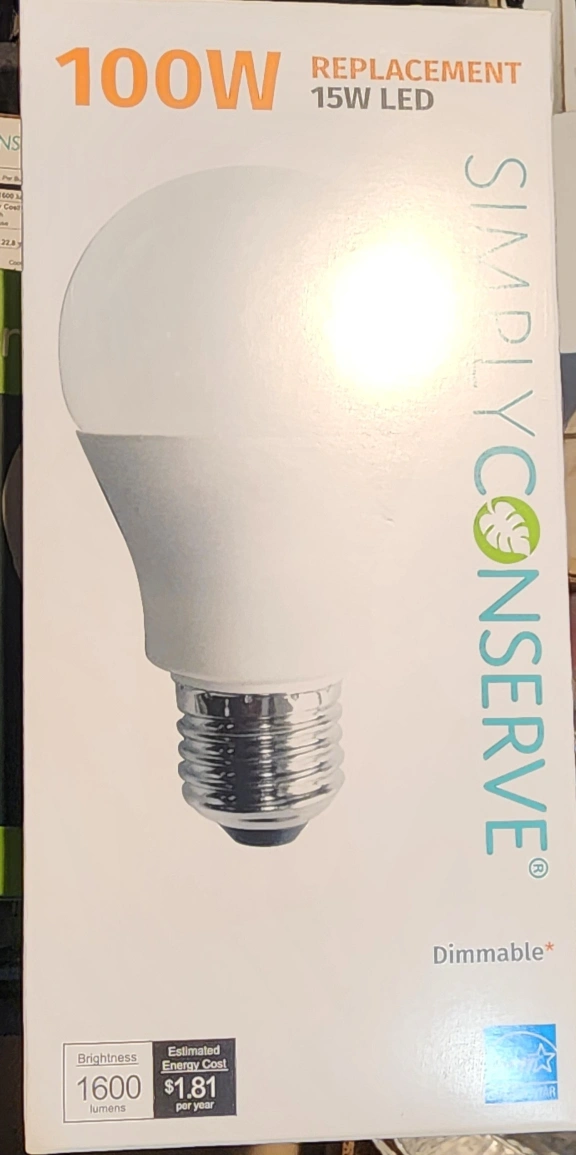 22A19 LED light bulb. Energy efficient, 15W, 1600 lumens, warm white light. Dimmable. 25,000 hour lifespan. 5-year limited warranty. Replaces a 100W incandescent bulb.