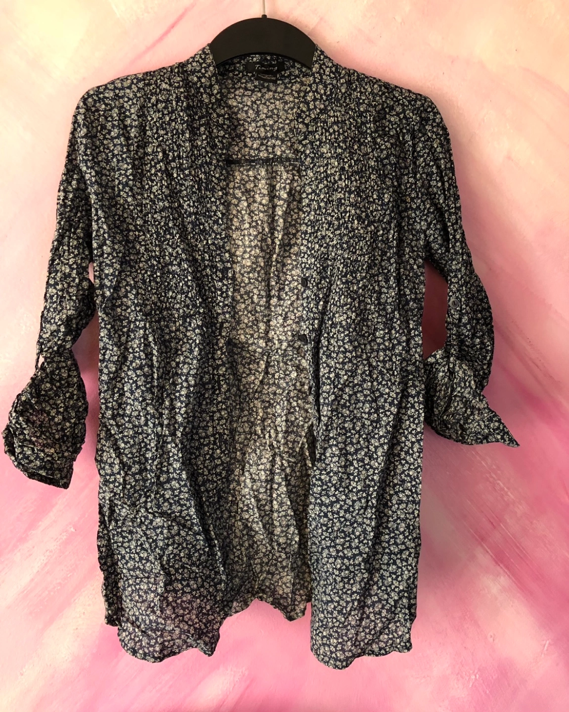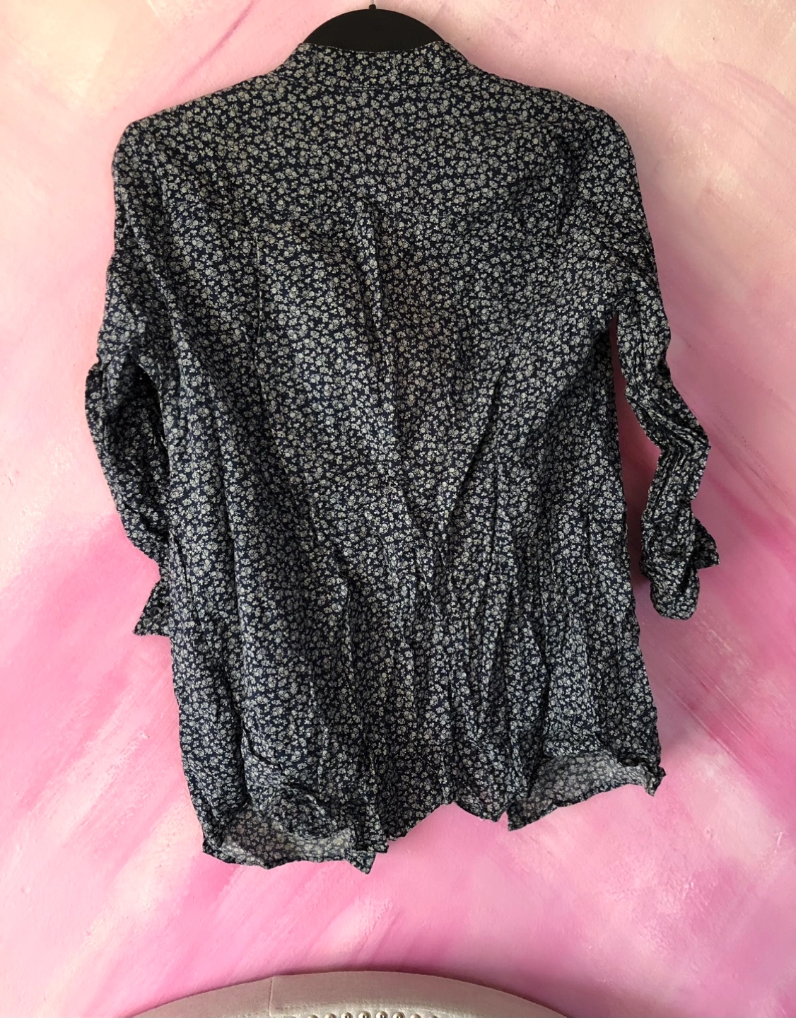 Dark blue and white floral print. Three-quarter sleeves. Button front. Lightweight fabric. Good condition.