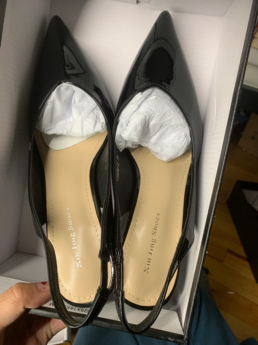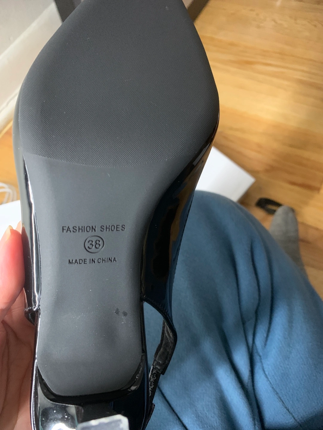 Pair of black patent leather slingback pumps. Pointed toe, low heel. Size 38, made in China. New, never worn.
