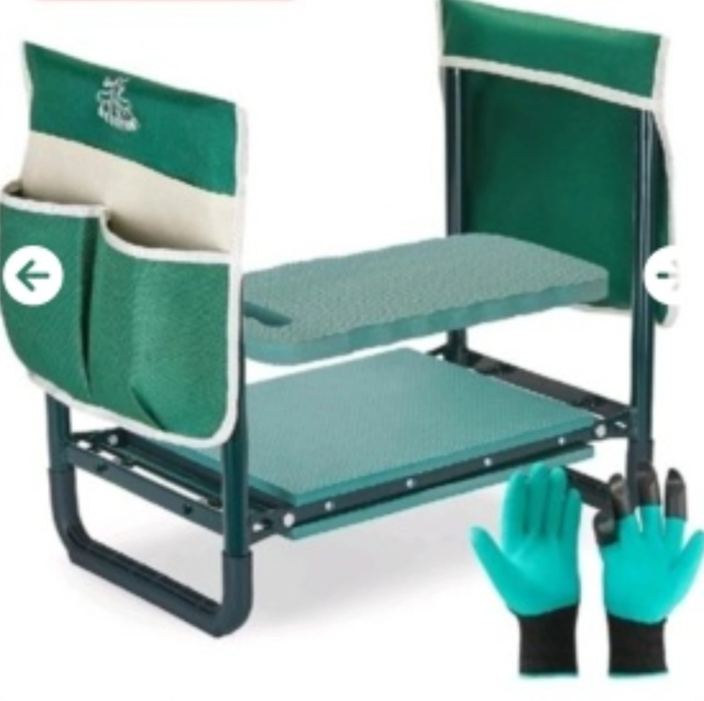 259Portable gardening kneeler and seat. Features two padded kneeling surfaces, a storage pouch with multiple pockets, and a pair of gardening gloves. Durable metal frame. Ideal for gardening.