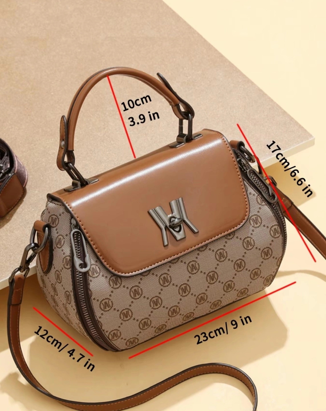 Stylish handbag. Features a top handle and an adjustable shoulder strap. Brown leather-like top and beige patterned body. Multiple zippered compartments. Perfect for everyday use.