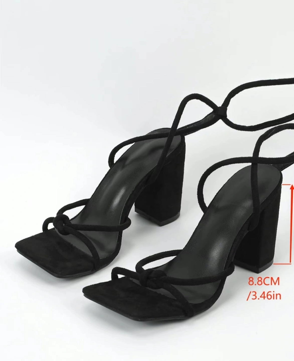 Elegant black sandals. Features lace-up design and block heels. Square toe. Perfect for a night out.