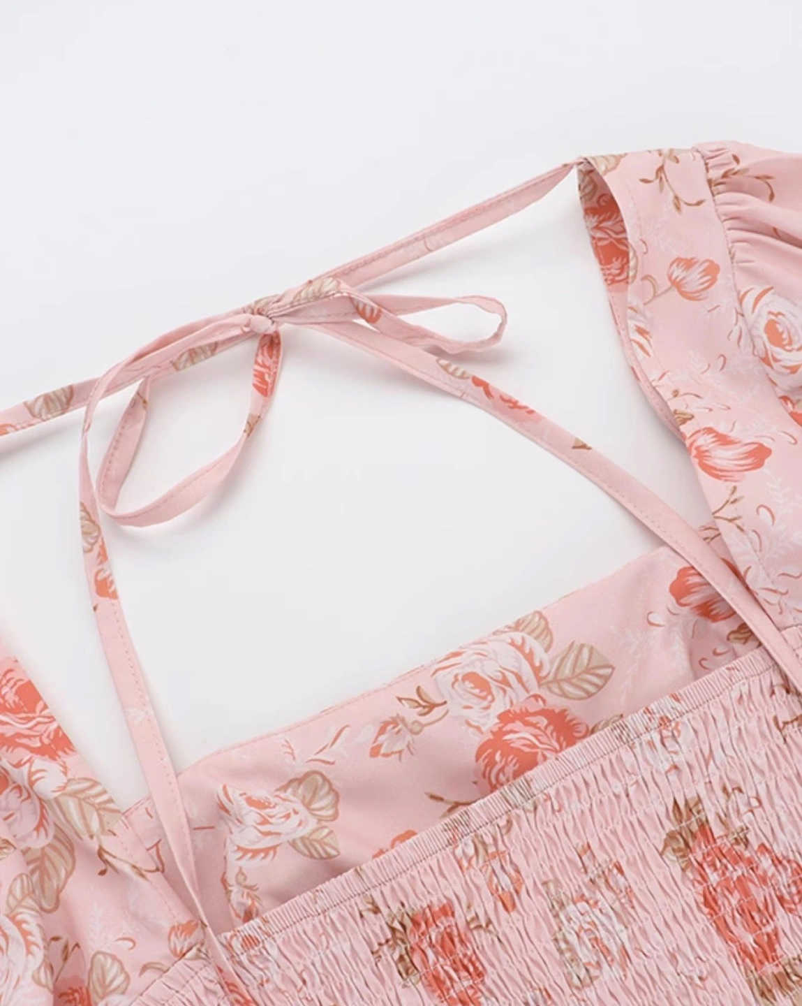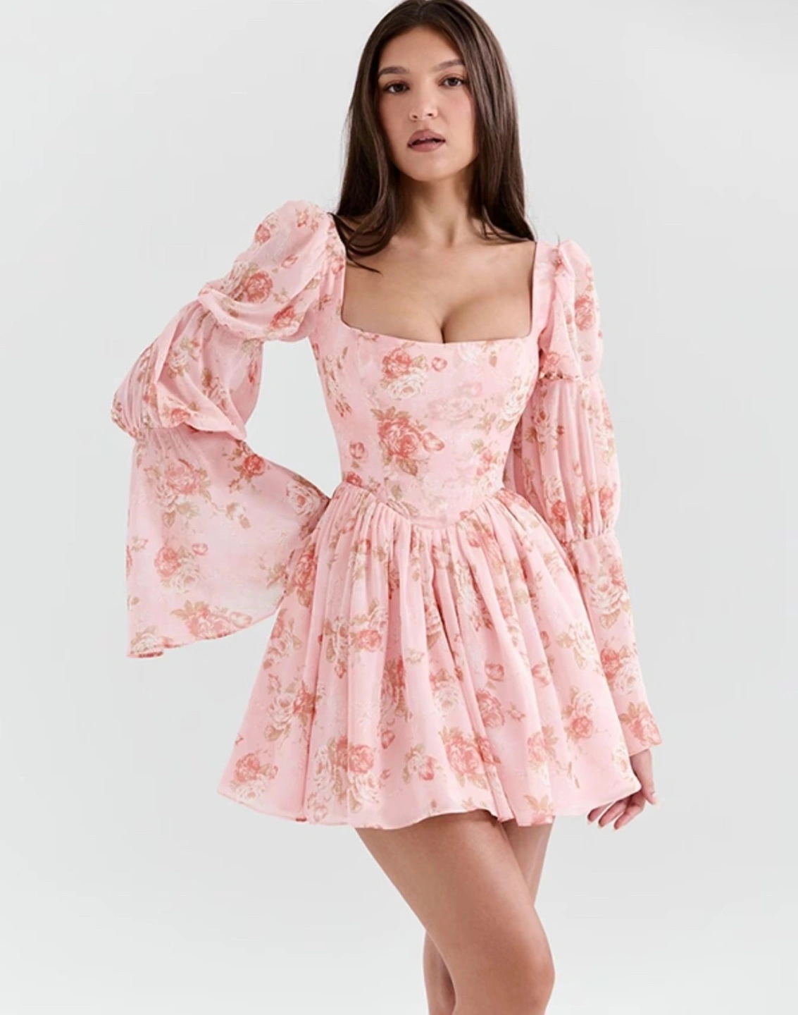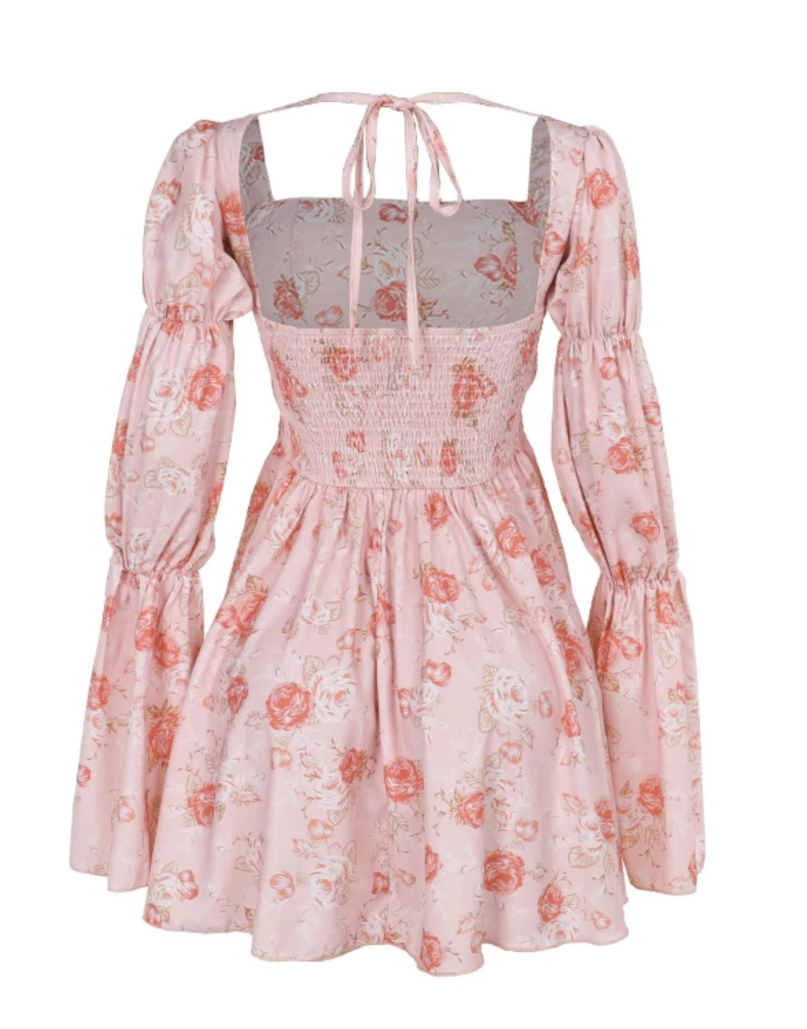 Adorable mini dress. Features a pink floral print, square neckline, long puff sleeves, and a fitted bodice. Back tie closure. Perfect for spring or summer.