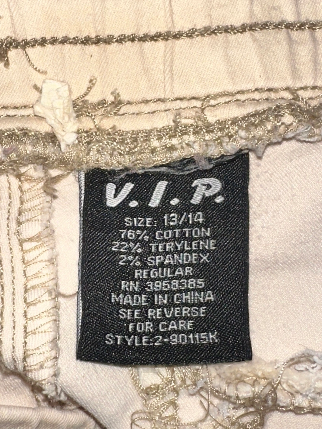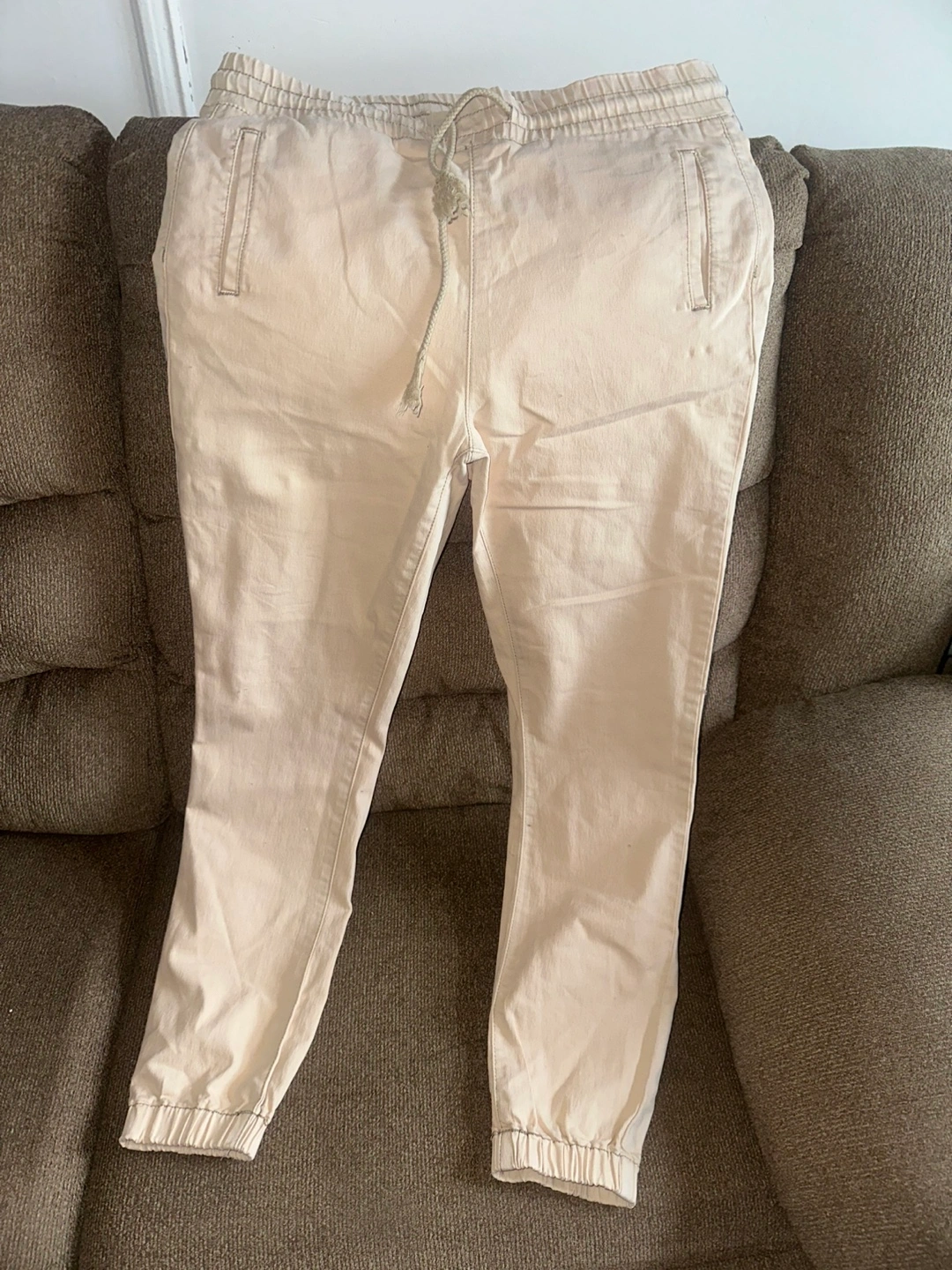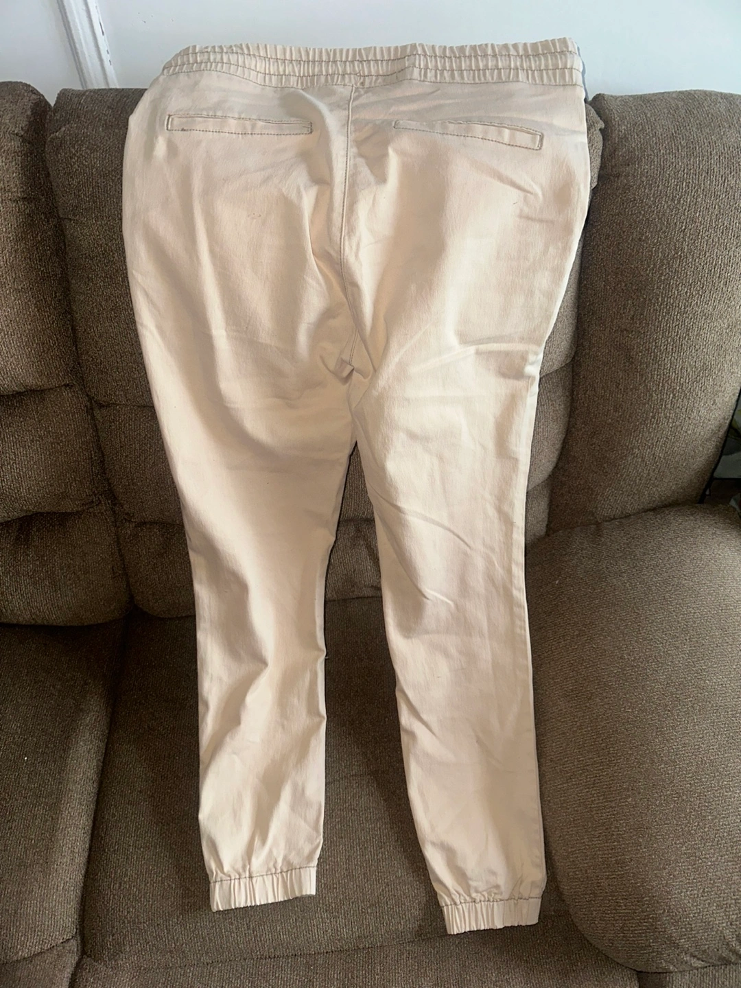 1000+Womens beige joggers. Size 13/14. Drawstring waist. Elastic cuffs. 76% cotton, 22% terylene, 2% spandex. Made in China.
