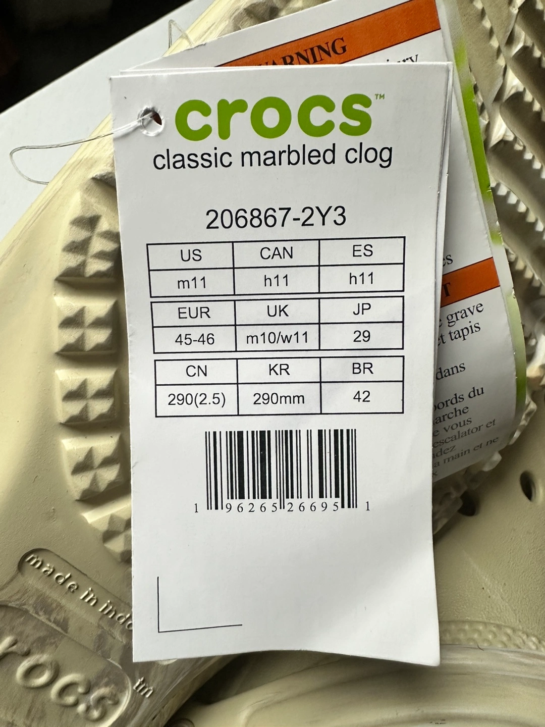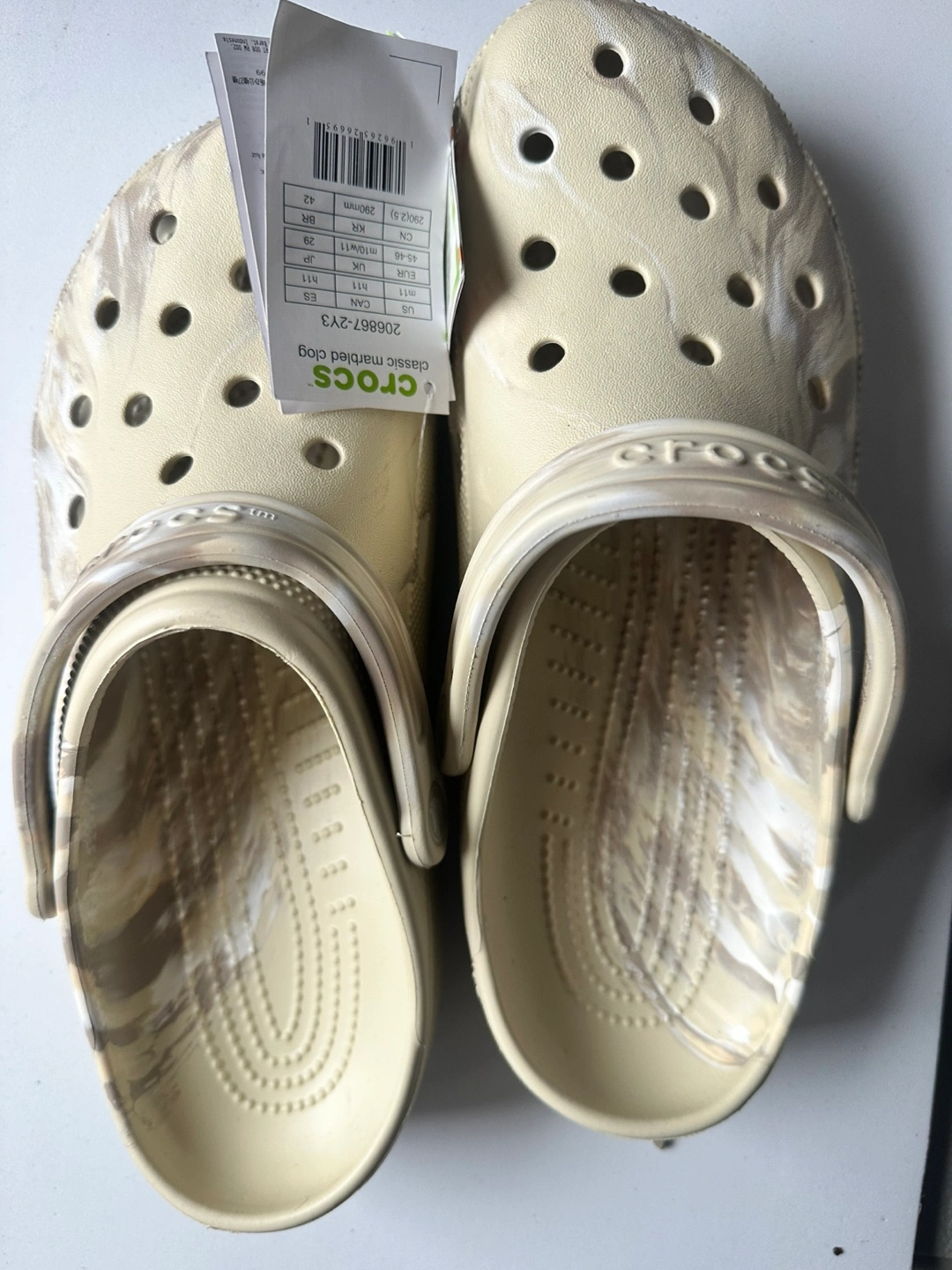 1000+I bought these original Crocs Classic Marbled Clogs directly from the official Crocs online store, but unfortunately, they are a bit too big for me. They are brand new, never worn outside, and still have the original tags attached! Details: ✔️ Size: M11 (Men’s) / H11 (Unisex) / EU 45-46 ✔️ Color: Beige/Marbled ✔️ Condition: Brand new with tags ✔️ Purchased from: Official Crocs store If you’re looking for 100% authentic Crocs at a great price, this is your chance!