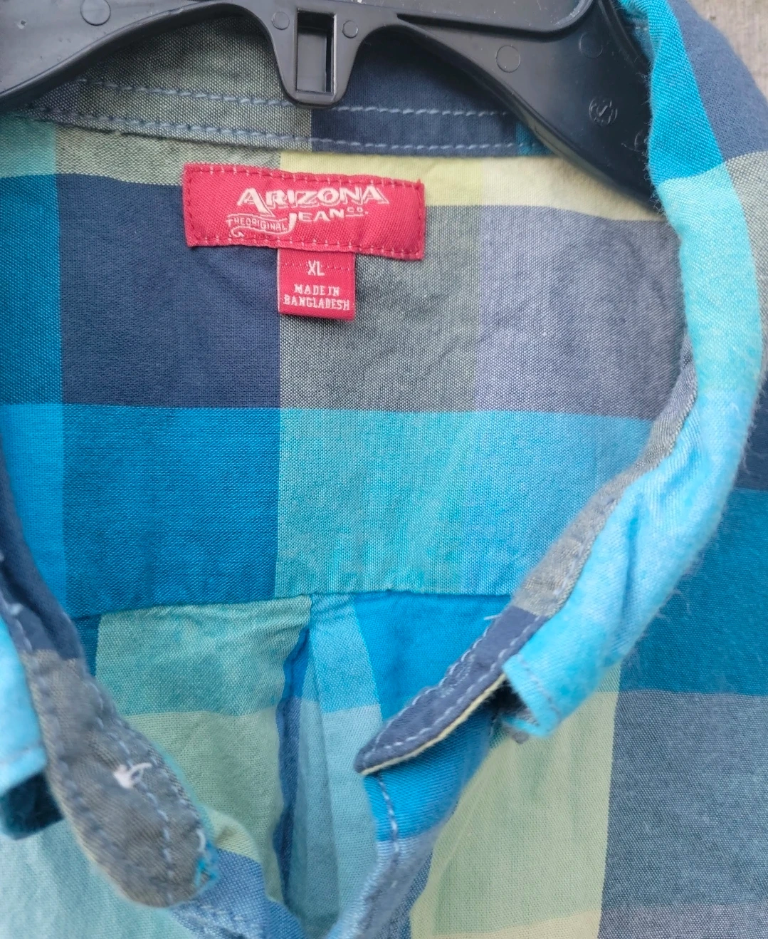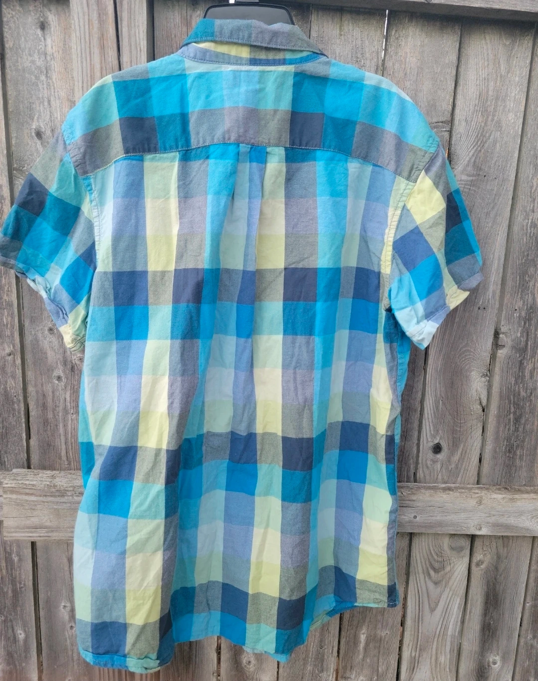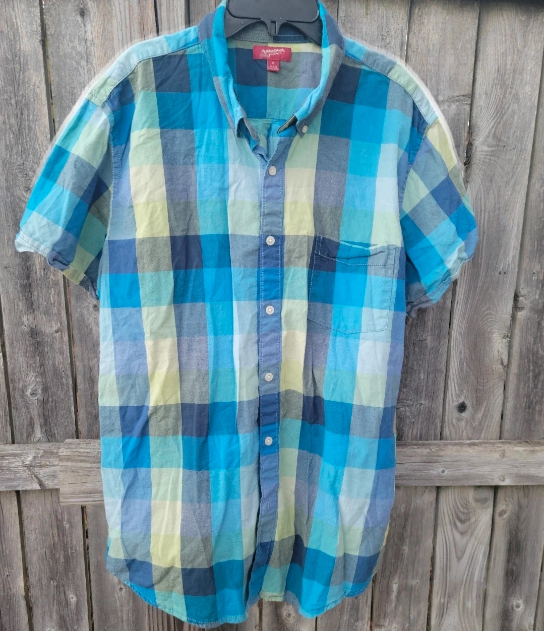 Arizona Jeans Co. short sleeve button-up shirt in size XL. It's a blue, yellow, and gray plaid pattern. Features a single chest pocket.