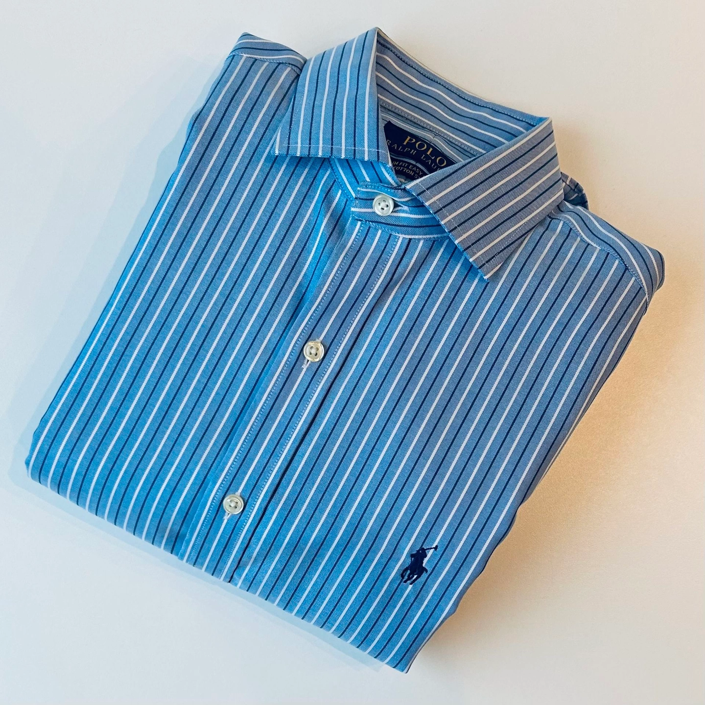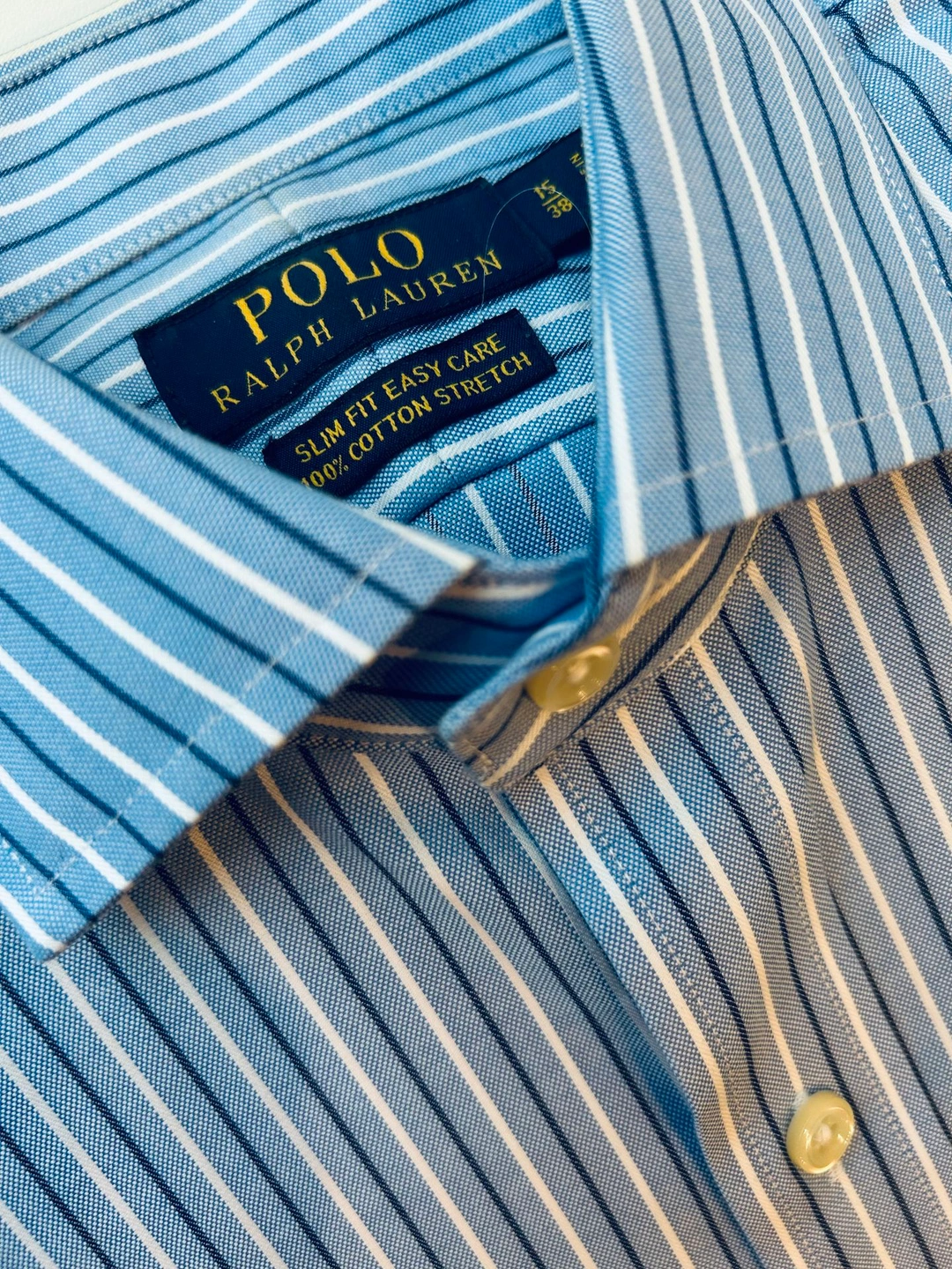 Impeccable Polo Ralph Lauren dress shirt in a refined sky blue with navy and white pinstripes. Crafted from 100% cotton stretch with an Easy Care finish, offering comfort and breathability. This shirt is in perfect condition—newly dry-cleaned, with no flaws, and finished with elegant mother-of-pearl buttons. Although labeled Slim Fit, the cut is not aggressively tapered, making it versatile.