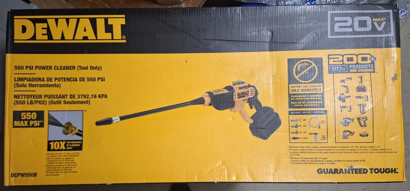 This is the DeWalt 20V MAX Power Cleaner, model DCPW550B. It delivers 550 PSI maximum power. The unit is sold as tool only and doesn't include a battery or charger.