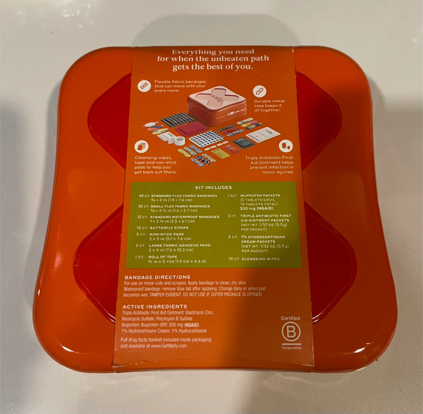 It includes flexible fabric bandages, cleansing wipes, and triple antibiotic first aid ointment packets. The metal case keeps it all together!